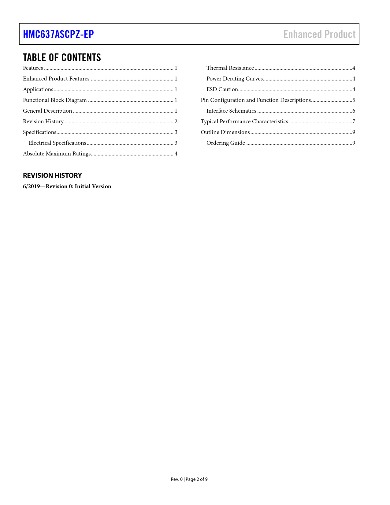 Pages / Page9 / 2 — HMC637ASCPZ-EP. Enhanced Product. TABLE OF CONTENTS. REVISION HISTORY …