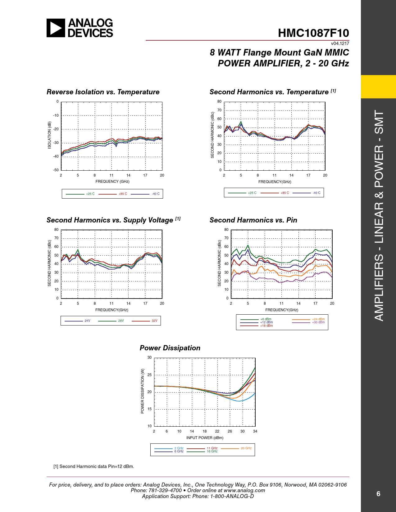 30 (W) 25 20 DISSIPATION 15 POWER 10 2 6 10 14 18 22 26 30 34 INPUT POWER (dBm) 2 GHz 11 GHz 20 GHz 6 GHz 16 GHz [1] second Harmonic data pin=12 dBm. For price, delivery, and to place orders: Analog Devices, Inc., One Technology Way, P.O. Box 9106, Norwood, MA 02062-9106 Phone: 781-329-4700 • Order online at www.analog.com Application Support: Phone: 1-800-ANALOG-D