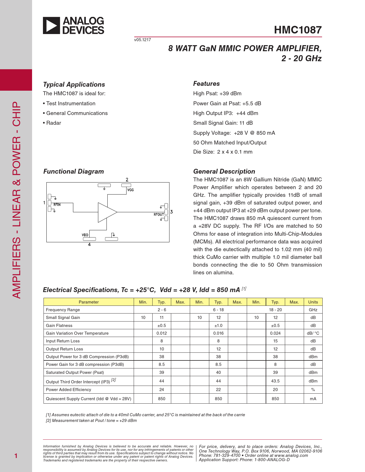 HMC1087. 8 WATT GaN MMIC POWER AMPLIFIER,. 2 - 20 GHz. Typical Applications. Features. Functional Diagram. General Description