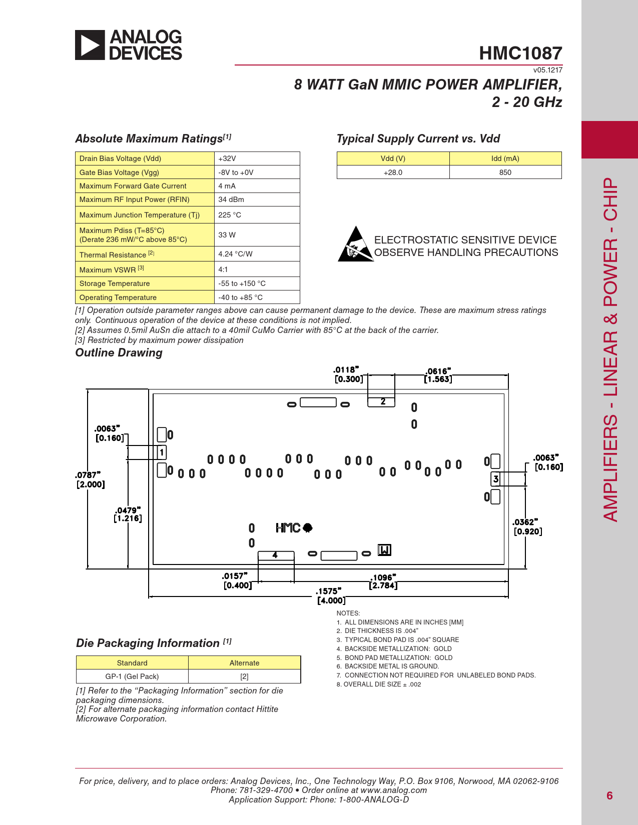 4. BACKSIDE METALLIZATION: GOLD 5. BOND PAD METALLIZATION: GOLD Standard Alternate 6. BACKSIDE METAL IS GROUND. 7. CONNECTION NOT REQUIRED FOR UNLABELED BOND PADS. GP-1 (Gel Pack) [2] 8. OVERALL DIE SIZE ± .002 [1] Refer to the “Packaging Information” section for die packaging dimensions. [2] For alternate packaging information contact Hittite Microwave Corporation. For price, delivery, and to place orders: Analog Devices, Inc., One Technology Way, P.O. Box 9106, Norwood, MA 02062-9106 Phone: 781-329-4700 • Order online at www.analog.com Application Support: Phone: 1-800-ANALOG-D