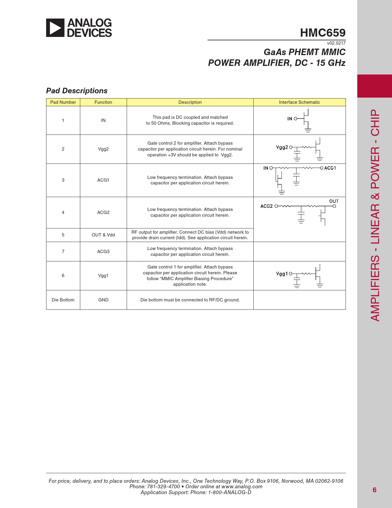 Pages / Page8 / 6 — HMC659. GaAs PHEMT MMIC. POWER AMPLIFIER, DC - 15 GHz. Pad Descriptions
