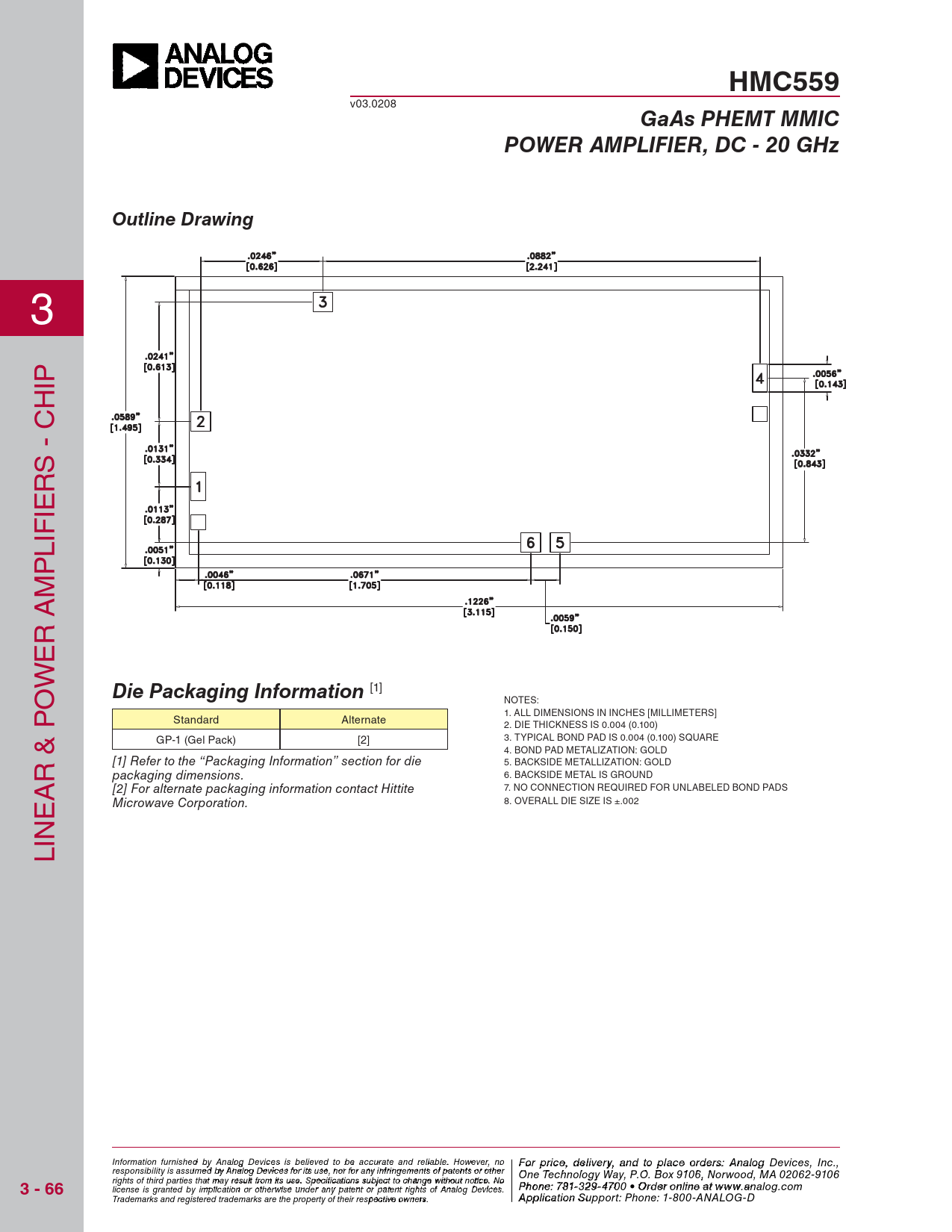 HMC559. GaAs PHEMT MMIC. POWER AMPLIFIER, DC - 20 GHz. Outline Drawing. Die Packaging Information. 3 - 66