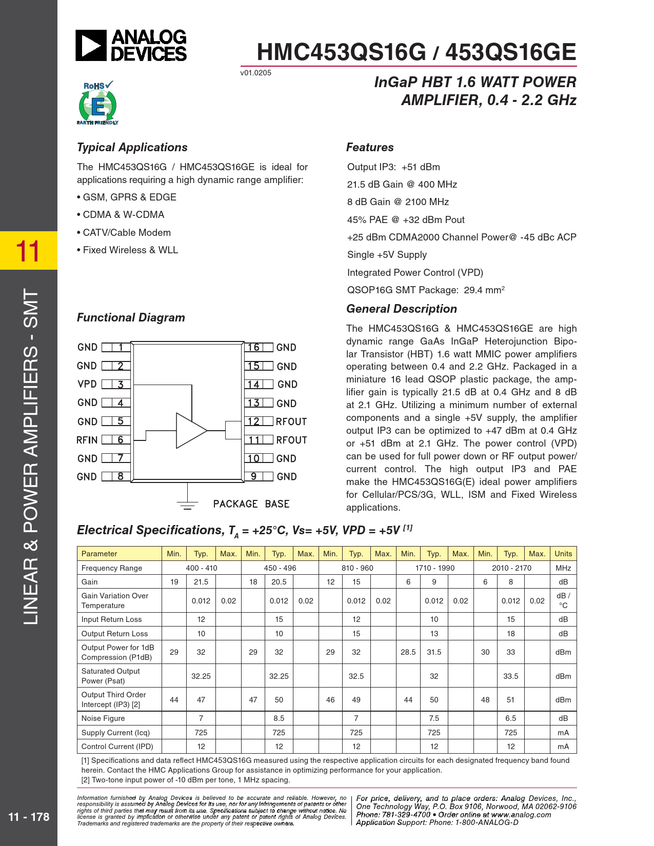 The HMC453QS16G & HMC453QS16GE are high - SM dynamic range GaAs InGaP Heterojunction Bipo- S lar Transistor (HBT) 1.6 watt MMIC power amplifi ers R operating between 0.4 and 2.2 GHz. Packaged in a IE miniature 16 lead QSOP plastic package, the amp- IF lifi er gain is typically 21.5 dB at 0.4 GHz and 8 dB L at 2.1 GHz. Utilizing a minimum number of external P components and a single +5V supply, the amplifi er M output IP3 can be optimized to +47 dBm at 0.4 GHz or +51 dBm at 2.1 GHz. The power control (VPD) can be used for full power down or RF output power/ R A current control. The high output IP3 and PAE E make the HMC453QS16G(E) ideal power amplifi ers W for Cellular/PCS/3G, WLL, ISM and Fixed Wireless O applications.