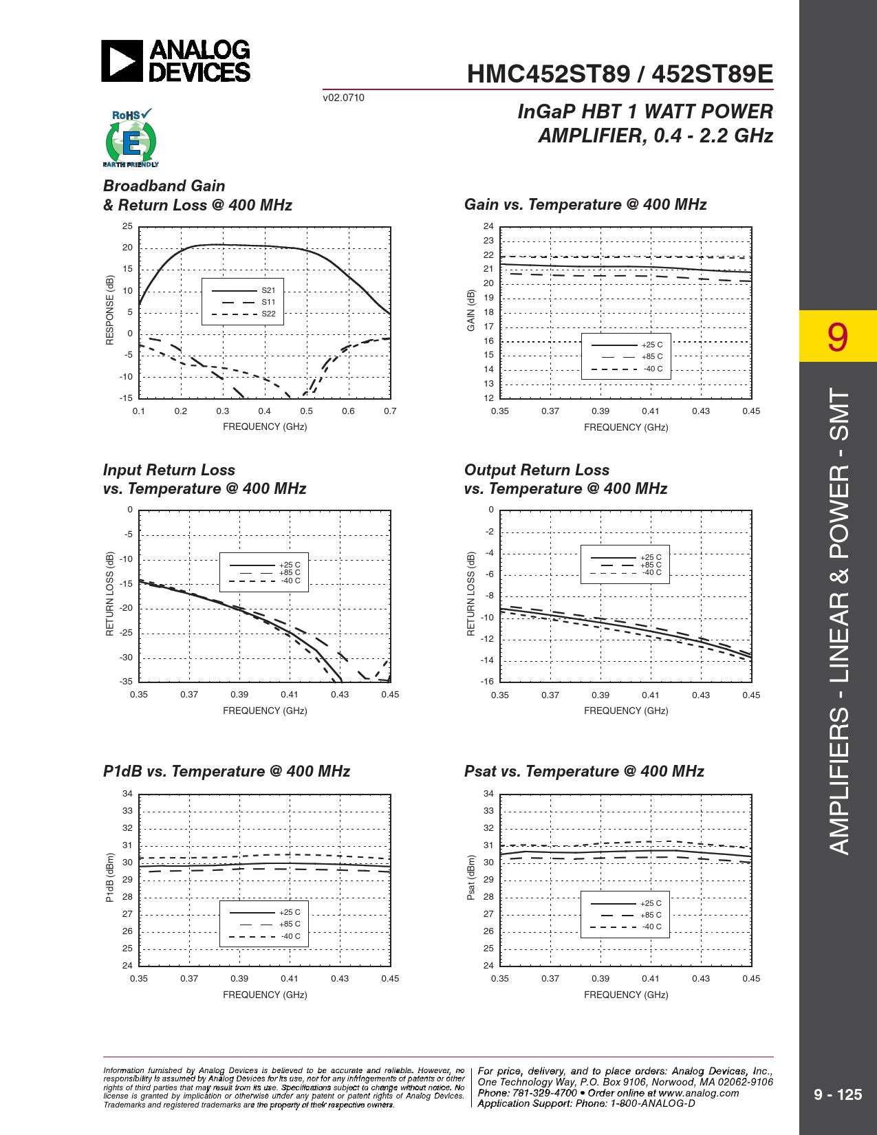 HMC452ST89 / 452ST89E v02.0710 InGaP HBT 1 WATT POWERAMPLIFIER, 0.4 - 2.2 GHzBroadband Gain & Return Loss @ 400 MHzGain vs. Temperature @ 400 MHz 25 24 23 20 22 15 21 20 10 S21 19 S11 (dB) 5 S22 18 17 GAIN 0 RESPONSE (dB) 16 +25 C 9 -5 15 +85 C 14 -40 C -10 13 -15 12 T 0.1 0.2 0.3 0.4 0.5 0.6 0.7 0.35 0.37 0.39 0.41 0.43 0.45 FREQUENCY (GHz) FREQUENCY (GHz) Input Return LossOutput Return Loss R - SM vs. Temperature @ 400 MHzvs. Temperature @ 400 MHz E 0 0 W -2 -5 O -4 +25 C -10 +25 C +85 C +85 C -6 -40 C -15 -40 C -8 -20 R & P -10 A RETURN LOSS (dB) -25 RETURN LOSS (dB) -12 E -30 -14 IN -35 -16 0.35 0.37 0.39 0.41 0.43 0.45 0.35 0.37 0.39 0.41 0.43 0.45 FREQUENCY (GHz) FREQUENCY (GHz) S - L R IE P1dB vs. Temperature @ 400 MHzPsat vs. Temperature @ 400 MHz IF 34 34 L 33 33 P 32 32 M 31 31 A 30 30 29 29 28 Psat (dBm) 28 P1dB (dBm) +25 C 27 +25 C 27 +85 C +85 C -40 C 26 26 -40 C 25 25 24 24 0.35 0.37 0.39 0.41 0.43 0.45 0.35 0.37 0.39 0.41 0.43 0.45 FREQUENCY (GHz) FREQUENCY (GHz) Info F rmoatr pr ion f iurcne, de ished b ly iv A e n r al y o a g D n evd to p ices is bla eli c eve o ed t rde o be ras: H ccuratite tiatne M d reli iacr ble ow . Ho av wev e C er, n o o rpo Fora r t p iro ic n e ,, 2 d 0 eli A ve lrpha R y, and toad, C o place hoel rd m er s s fo : Ard, MA 01 nalog Devic 8 e 2 s 4 , Inc., responsibility is assumed by Analog Devices for its use, nor for any infringements of patents or other One Technology Way, P.O. Box 9106, Norwood, MA 02062-9106 Phone: 978-250-3343 Fax: 978-250-3373 O rights of third parties that may result from its use. Specifications subject to change without notice. No P rde hone r O : 7 n 81- -3li 2n 9 e a -47 t w 0 w 0 • O w rd .ehit r o t nilte in .c e ao t m license is granted by implication or otherwise under any patent or patent rights of Analog Devices. www.analog.com 9 - 125 Application Support: Pho Trademarks and registered trademarks are the property of their respective owners. ne: 978-250-33 A 4 p 3 o plica r app tion Su s p @ po h rt itt : P ite ho .c ne o : 1m -800-ANALOG-D
