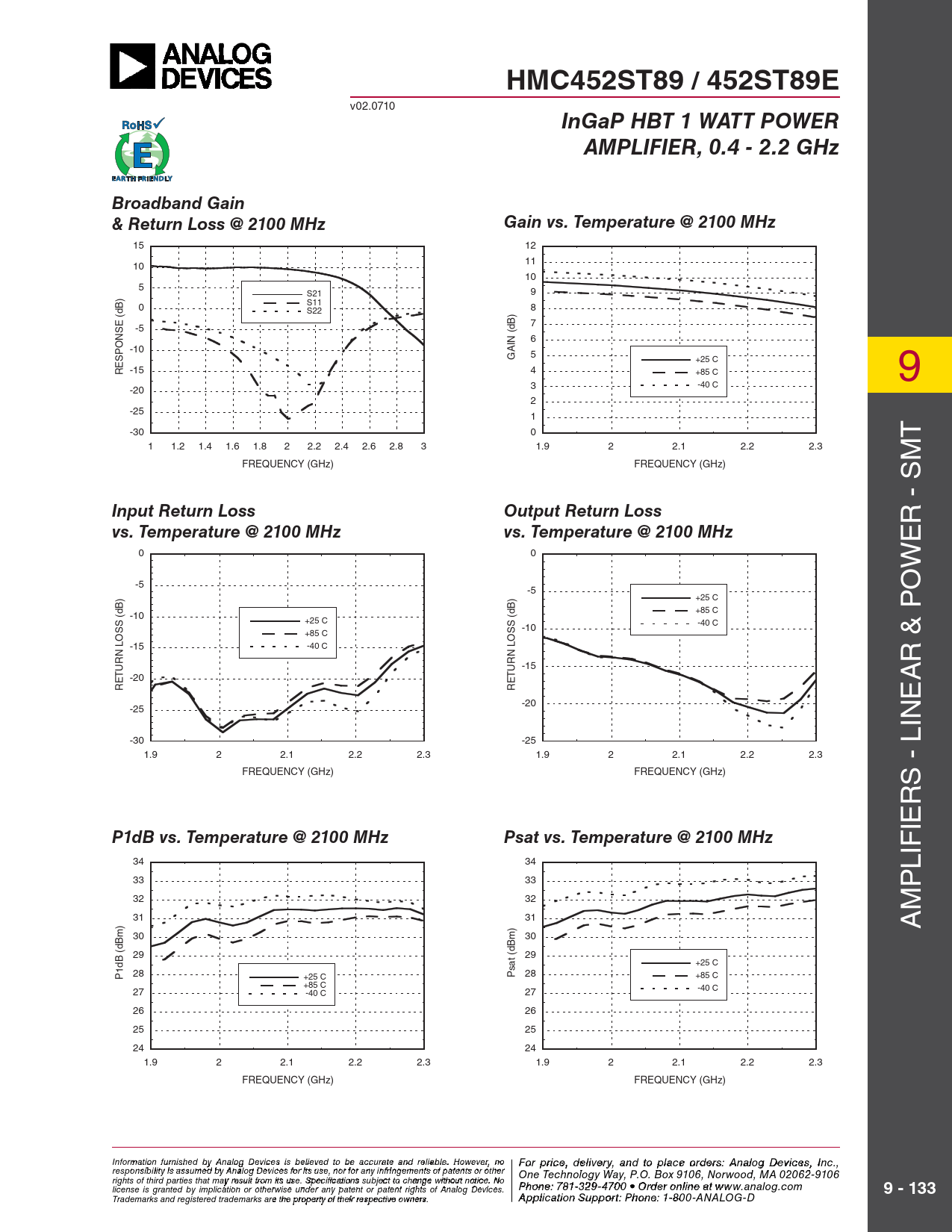 HMC452ST89 / 452ST89E v02.0710 InGaP HBT 1 WATT POWERAMPLIFIER, 0.4 - 2.2 GHzBroadband Gain & Return Loss @ 2100 MHzGain vs. Temperature @ 2100 MHz 15 12 11 10 10 5 S21 9 S11 0 S22 8 7 -5 (dB) 6 -10 5 GAIN +25 C -15 RESPONSE (dB) 4 +85 C -40 C 9 3 -20 2 -25 1 -30 0 T 1 1.2 1.4 1.6 1.8 2 2.2 2.4 2.6 2.8 3 1.9 2 2.1 2.2 2.3 FREQUENCY (GHz) FREQUENCY (GHz) Input Return LossOutput Return Loss R - SM vs. Temperature @ 2100 MHzvs. Temperature @ 2100 MHz E 0 0 W -5 -5 O +25 C +85 C -10 +25 C -40 C -10 +85 C -15 -40 C R & P -15 -20 A RETURN LOSS (dB) RETURN LOSS (dB) E -20 -25 IN -30 -25 1.9 2 2.1 2.2 2.3 1.9 2 2.1 2.2 2.3 FREQUENCY (GHz) FREQUENCY (GHz) S - L R IE P1dB vs. Temperature @ 2100 MHzPsat vs. Temperature @ 2100 MHz IF 34 34 L 33 33 P 32 32 M 31 31 A 30 30 29 29 +25 C 28 P1dB (dBm) +25 C Psat (dBm) 28 +85 C +85 C 27 -40 C -40 C 27 26 26 25 25 24 24 1.9 2 2.1 2.2 2.3 1.9 2 2.1 2.2 2.3 FREQUENCY (GHz) FREQUENCY (GHz) Info F rmoatr pr ion f iurcne, de ished b ly iv A e n r al y o a g D n evd to p ices is bla eli c eve o ed t rde o be ras: H ccuratite tiatne M d reli iacr ble ow . Ho av wev e C er, n o o rpo Fora r t p iro ic n e ,, 2 d 0 eli A ve lrpha R y, and toad, C o place hoel rd m er s s fo : Ard, MA 01 nalog Devic 8 e 2 s 4 , Inc., responsibility is assumed by Analog Devices for its use, nor for any infringements of patents or other One Technology Way, P.O. Box 9106, Norwood, MA 02062-9106 Phone: 978-250-3343 Fax: 978-250-3373 O rights of third parties that may result from its use. Specifications subject to change without notice. No P rde hone r O : 7 n 81- -3li 2n 9 e a -47 t w 0 w 0 • O w rd .ehit r o t nilte in .c e ao t m license is granted by implication or otherwise under any patent or patent rights of Analog Devices. www.analog.com 9 - 133 Application Support: Pho Trademarks and registered trademarks are the property of their respective owners. ne: 978-250-33 A 4 p 3 o plica r app tion Su s p @ po h rt itt : P ite ho .c ne o : 1m -800-ANALOG-D