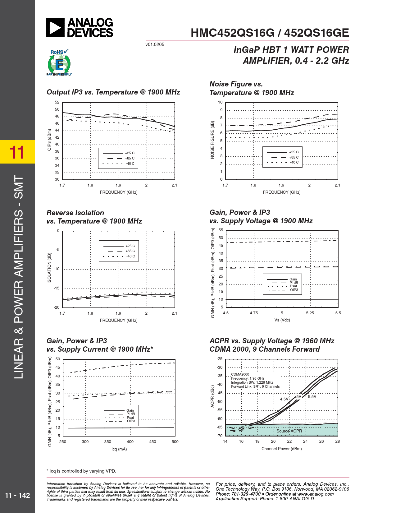 0 55 50 +25 C 45 PLIFIER -5 +85 C 40 -40 C M 35 -10 30 Psat (dBm), OIP3 (dBm) 25 Gain ISOLATION (dB) 20 P1dB ER A Psat -15 OIP3 15 W 10 O -20 5 1.7 1.8 1.9 2 2.1 4.5 4.75 5 5.25 5.5 GAIN (dB), P1dB (dBm), FREQUENCY (GHz) Vs (Vdc) & P R