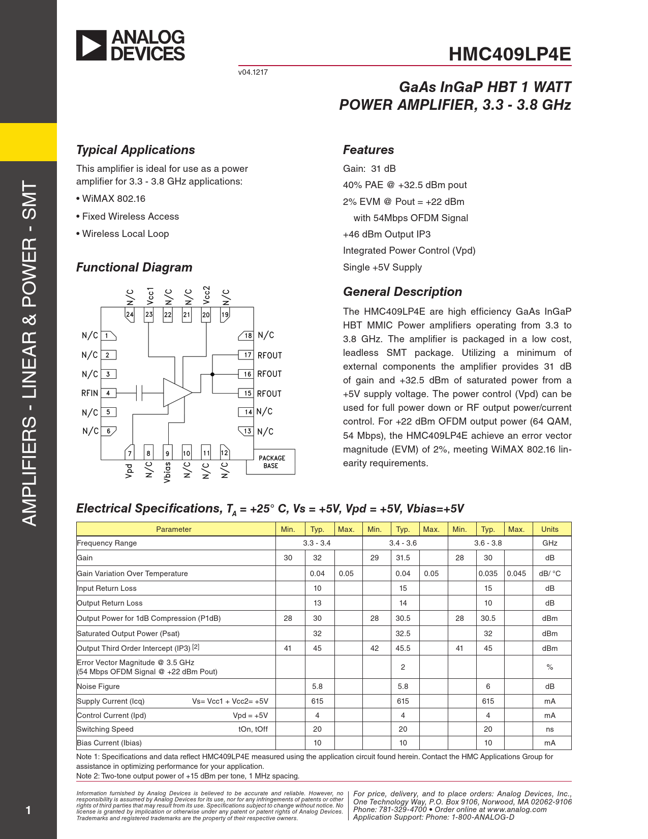 HMC409LP4E. GaAs InGaP HBT 1 WATT. POWER AMPLIFIER, 3.3 - 3.8 GHz. Typical Applications. Features. Functional Diagram
