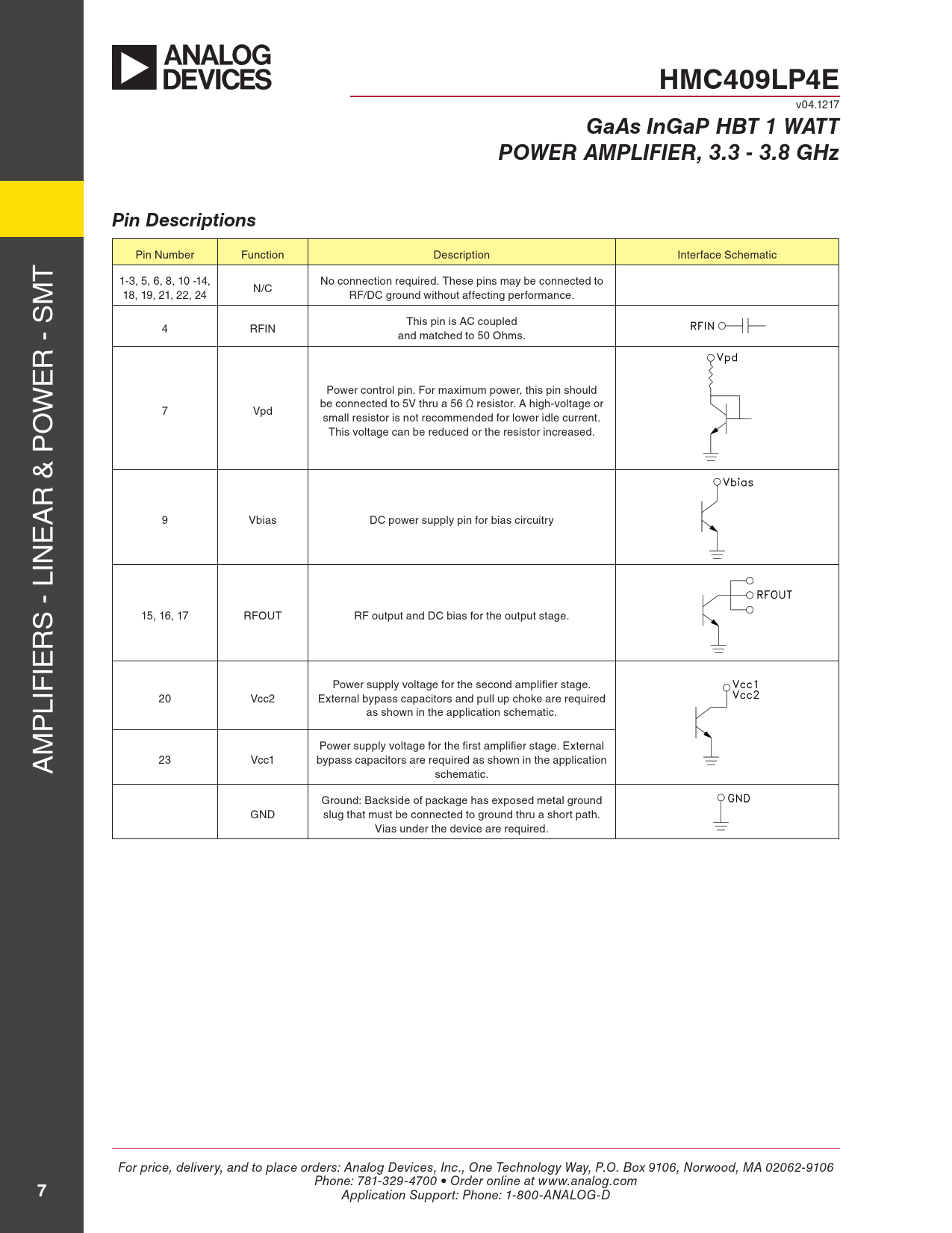 HMC409LP4E v04.1217 GaAs InGaP HBT 1 WATTPOWER AMPLIFIER, 3.3 - 3.8 GHzPin Descriptions pin number function Description interface schematic T m 1-3, 5, 6, 8, 10 -14, no connection required. These pins may be connected to n/C 18, 19, 21, 22, 24 rf/DC ground without affecting performance. s This pin is AC coupled 4 rfin and matched to 50 ohms. r - e w power control pin. for maximum power, this pin should be connected to 5V thru a 56 Ω resistor. A high-voltage or o 7 Vpd small resistor is not recommended for lower idle current. p This voltage can be reduced or the resistor increased. r & A e 9 Vbias DC power supply pin for bias circuitry lin s - 15, 16, 17 rfoUT rf output and DC bias for the output stage. r ie power supply voltage for the second amplifier stage. lif 20 Vcc2 external bypass capacitors and pull up choke are required p as shown in the application schematic. m power supply voltage for the first amplifier stage. external A 23 Vcc1 bypass capacitors are required as shown in the application schematic. Ground: Backside of package has exposed metal ground GnD slug that must be connected to ground thru a short path. Vias under the device are required. For price, delivery, and to place orders: Analog Devices, Inc., One Technology Way, P.O. Box 9106, Norwood, MA 02062-9106 Phone: 781-329-4700 • Order online at www.analog.com 7 Application Support: Phone: 1-800-ANALOG-D Document Outline Typical Applications Features Functional Diagram General Description Electrical Specifications EVM vs. Temperature @ 3.5 GHz OFDM 54 Mbps Signal Power Dissipation Gain, Power & Quiescent Supply Current vs. Vpd @ 3.5 GHz Noise Figure vs. Temperature Gain & Power vs. Supply Voltage Power Compression @ 3.5 GHz Output IP3 vs. Temperature Psat vs. Temperature P1dB vs. Temperature Power Down Isolation vs. Temperature Reverse Isolation vs. Temperature Output Return Loss vs. Temperature Input Return Loss vs. Temperature Gain vs. Temperature Broadband Gain & Return Loss Absolute Maximum Ratings Typical Supply, Current vs. Supply Voltage, Vcc1 = Vcc2 = Vpd Outline Drawing Package Information Application Circuit Pin Descriptions Evaluation PCB List of Materials