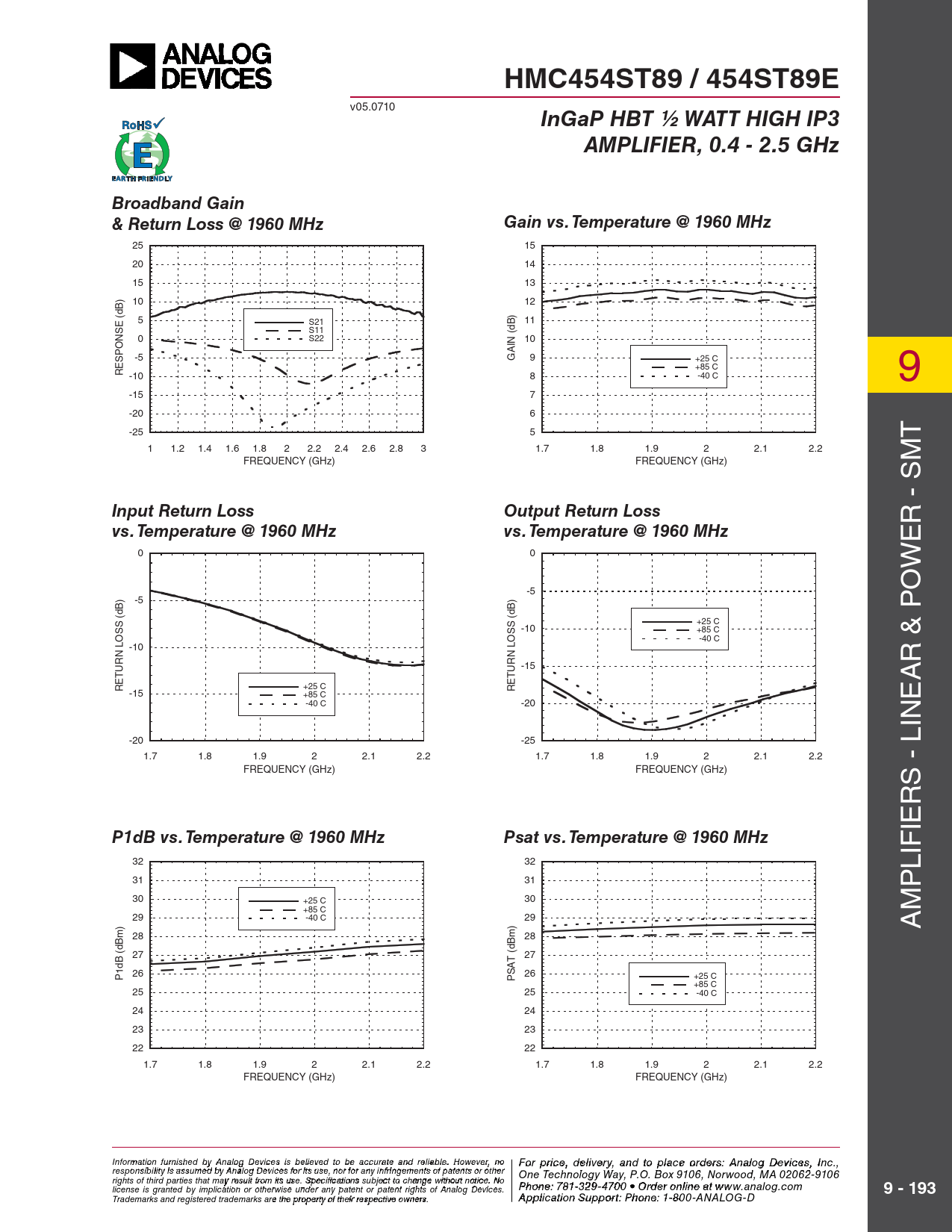 InGaP HBT ½ WATT HIGH IP3 AMPLIFIER, 0.4 - 2.5 GHz Broadband Gain & Return Loss @ 1960 MHz Gain vs. Temperature @ 1960 MHz