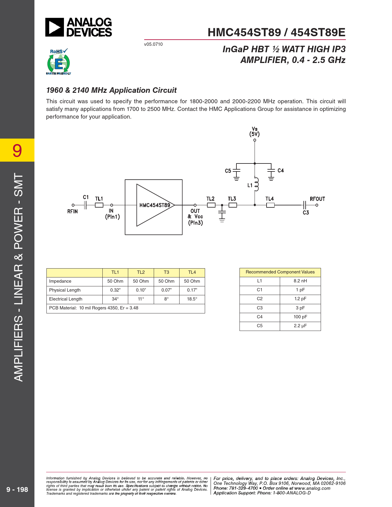 HMC454ST89 / 454ST89E. InGaP HBT ½ WATT HIGH IP3. AMPLIFIER, 0.4 - 2.5 GHz. 1960 & 2140 MHz Application Circuit. 9 - 198