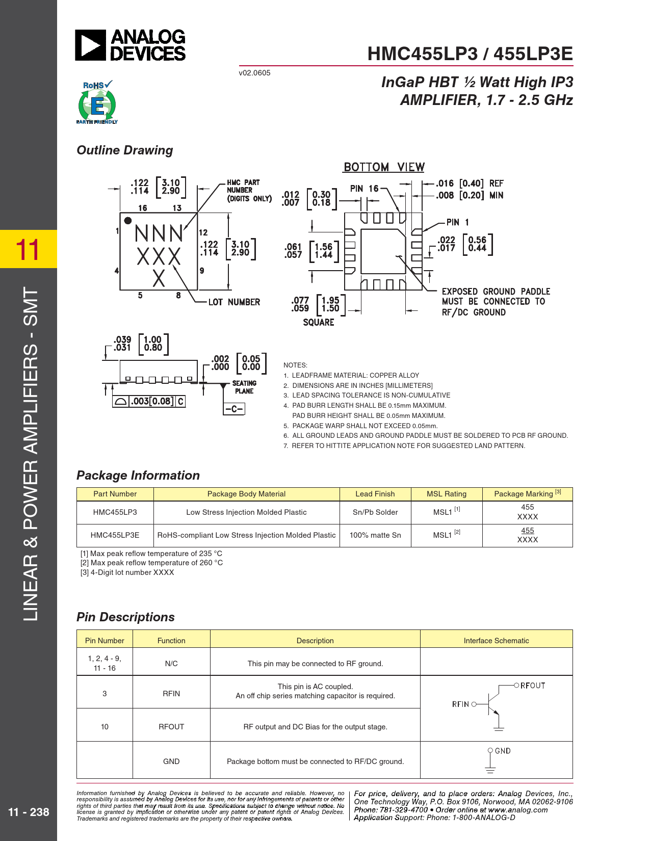 HMC455LP3 / 455LP3E InGaP HBT ½ Watt High IP3 AMPLIFIER, 1.7 - 2.5 GHz Outline Drawing Package Information Pin Descriptions