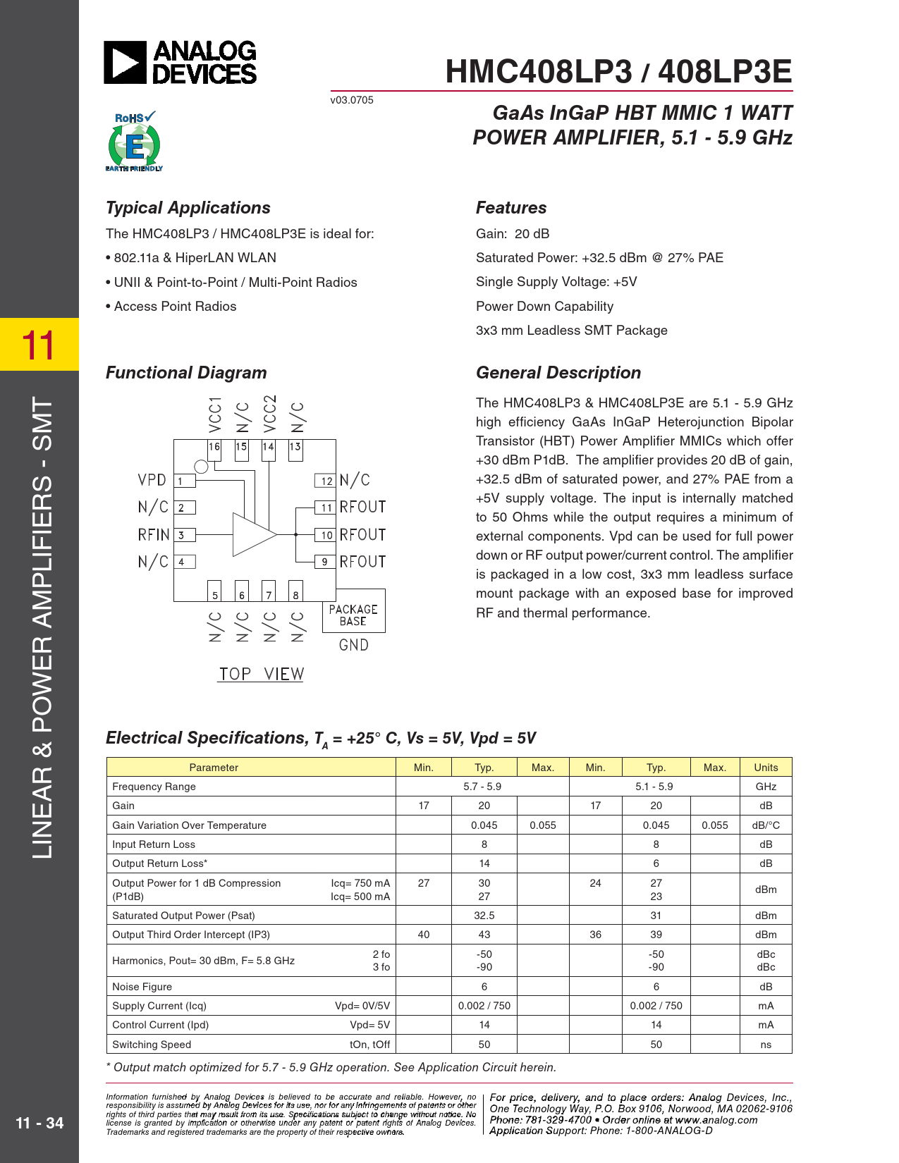 Datasheet HMC408LP3, 408LP3E (Analog Devices)