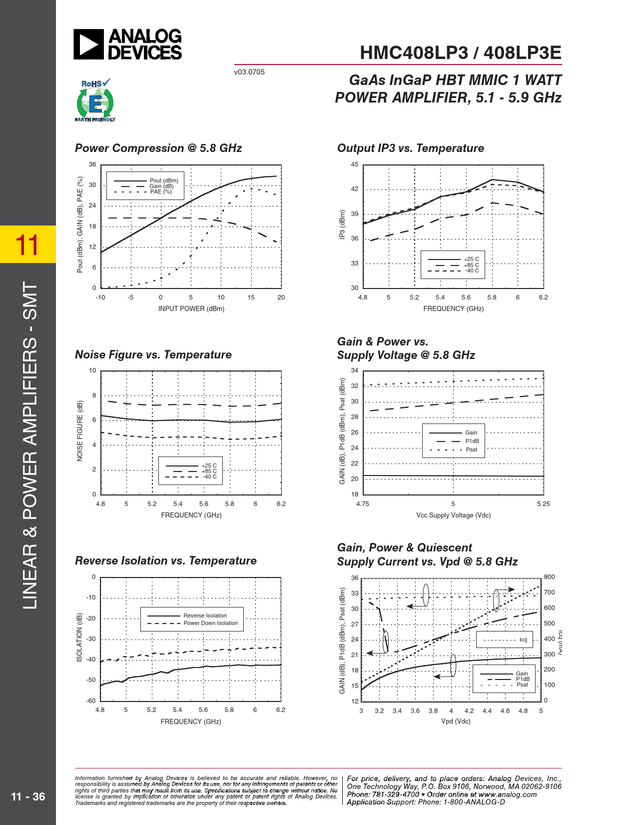 HMC408LP3 / 408LP3E. GaAs InGaP HBT MMIC 1 WATT. POWER AMPLIFIER, 5.1 - 5.9 GHz. Power Compression @ 5.8 GHz