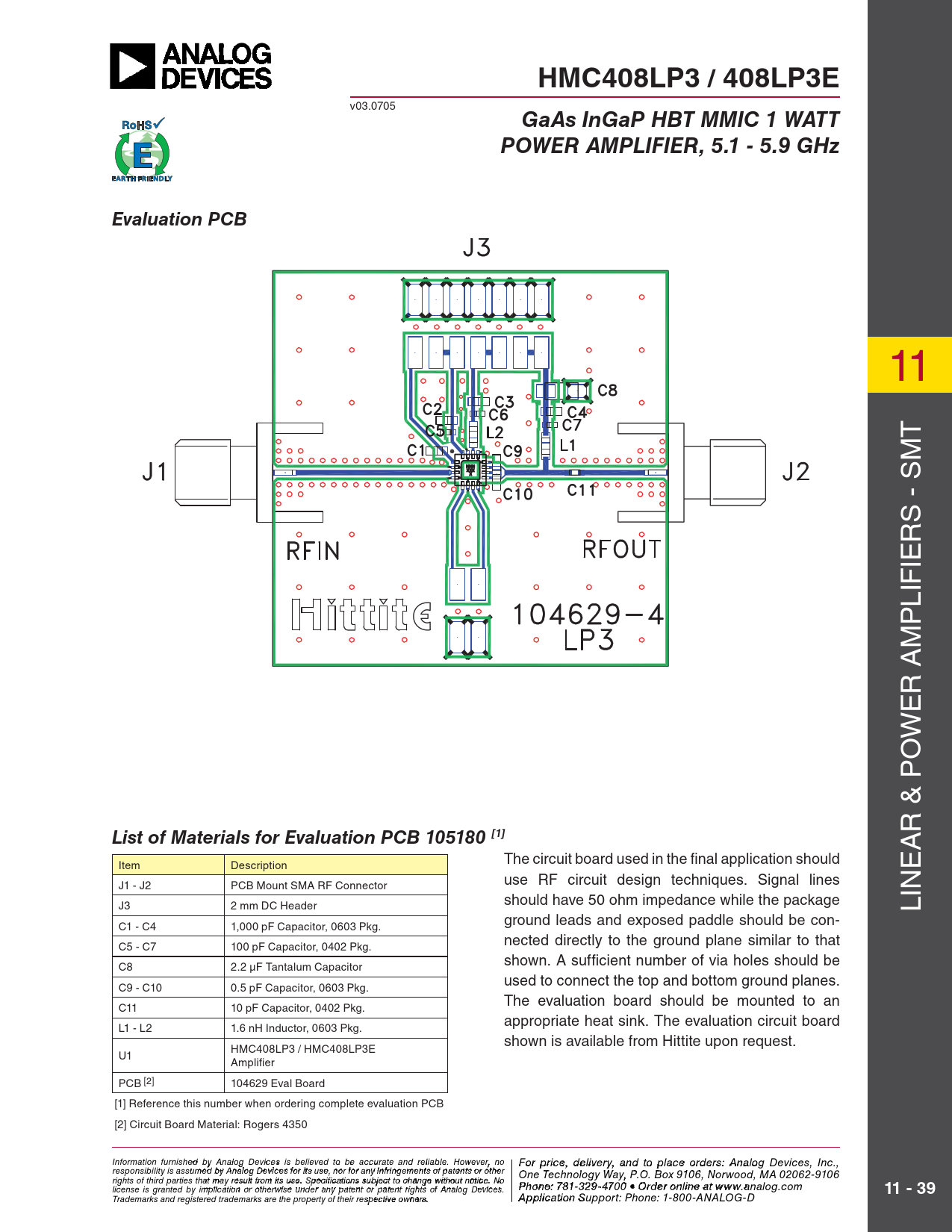 HMC408LP3 / 408LP3E. GaAs InGaP HBT MMIC 1 WATT. POWER AMPLIFIER, 5.1 - 5.9 GHz. Evaluation PCB