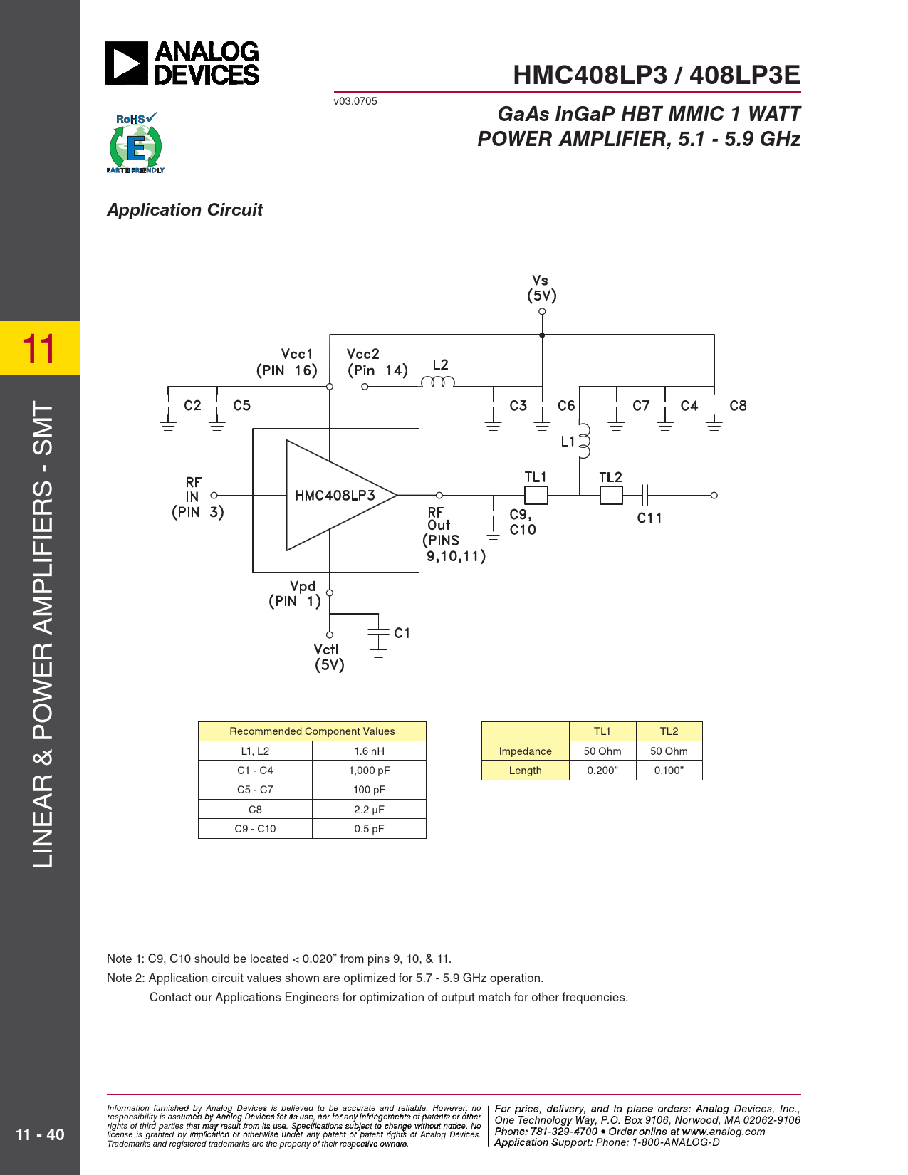 HMC408LP3 / 408LP3E. GaAs InGaP HBT MMIC 1 WATT. POWER AMPLIFIER, 5.1 - 5.9 GHz. Application Circuit. 11 - 40