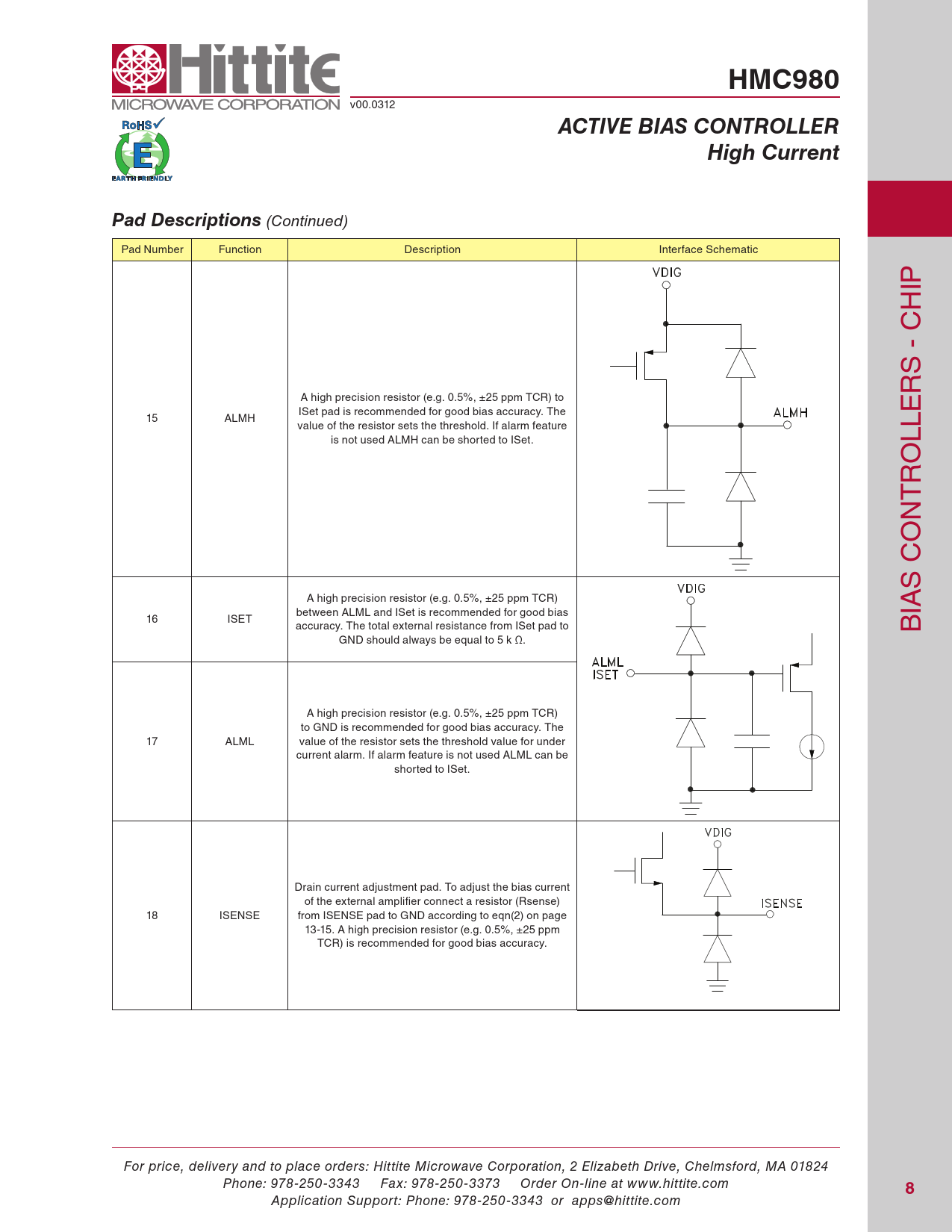 HMC980 v00.0312 Active BiAs controllerHigh currentPad Descriptions (Continued) pad number Function Description interface schematic ip h s - C r a high precision resistor (e.g. 0.5%, ±25 ppm tCr) to iset pad is recommended for good bias accuracy. the 15 alMh value of the resistor sets the threshold. if alarm feature is not used alMh can be shorted to iset. lle o r t n o s C a high precision resistor (e.g. 0.5%, ±25 ppm tCr) between alMl and iset is recommended for good bias ia 16 iset accuracy. the total external resistance from iset pad to B GnD should always be equal to 5 k Ω. a high precision resistor (e.g. 0.5%, ±25 ppm tCr) to GnD is recommended for good bias accuracy. the 17 alMl value of the resistor sets the threshold value for under current alarm. if alarm feature is not used alMl can be shorted to iset. Drain current adjustment pad. to adjust the bias current of the external amplifier connect a resistor (rsense) 18 isense from isense pad to GnD according to eqn(2) on page 13-15. a high precision resistor (e.g. 0.5%, ±25 ppm tCr) is recommended for good bias accuracy. For price, delivery and to place orders: Hittite Microwave Corporation, 2 Elizabeth Drive, Chelmsford, MA 01824 Phone: 978-250-3343 Fax: 978-250-3373 Order On-line at www.hittite.com 8 Application Support: Phone: 978-250-3343 or apps@hittite.com Document Outline Typical Applications Features Functional Diagram General Description Electrical Specifications Typical Performance Characteristics Bias Current Accuracy[1] Bias Current Accuracy[2] Power Up Waveform Shutdown Waveform Enable Waveform Disable Waveform Load Regulation @ VDD=5V, VDIG=3.3V, SW0=GND, SW1=GND Load Regulation @ VDD=5V, VDIG=3.3V, SW0=3.3V, SW1=GND Load Regulation @ VDD=16.5V, VDIG=5.0V, SW0=GND, SW1=VDIG Load Regulation @ VDD=16.5V, VDIG=5.0V, SW0=VDIG, SW1=VDIG VNEG Load Regulation @ VDD=5V VNEG Load Regulation @ VDD=16.5V VNEG Load Transient VDD=5V VNEG Load Transient VDD=16.5V VGATE Load Regulation @ VDD=12V [1] VG2 Load Regulation @ VDD=12V [2] VNEG Line Regulation vs. Supply Voltage Absolute Maximum Ratings Outline Drawing Pad Descriptions Application Notes Detailed Description Digital Power Supply (VDIG) Supply and Drain Voltage (VDD and VDRAIN) Table 1. REcommended Current Range Configuration Negative Voltage Generator (VNEGOUT) Enable/Disable (EN) Active Bias Control Loop VG2 Voltage Adjustment Self Protection Feature VNEG Fault Detection Feature Daisy-Chain Operation Operation Modes Table 2 - The List of Bias Settings for Various Hittite Amplifiers Table 3 - List of Bias Settings for Various Hittite Amplifiers