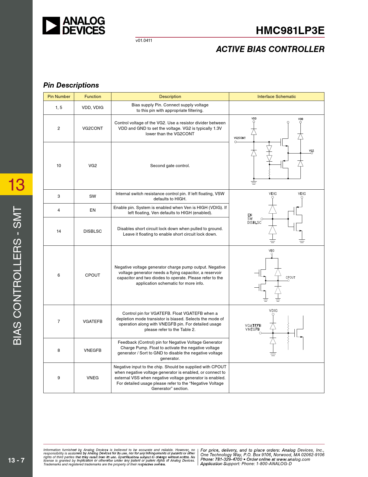 HMC981LP3E v01.0411 ACTIVE BIAS CONTROLLERPin Descriptions Pin Number Function Description Interface Schematic Bias supply Pin. Connect supply voltage 1, 5 VDD, VDIG to this pin with appropriate filtering. Control voltage of the VG2. Use a resistor divider between 2 VG2CONT VDD and GND to set the voltage. VG2 is typically 1.3V lower than the VG2CONT 10 VG2 Second gate control. 13 Internal switch resistance control pin. If left floating, VSW 3 SW defaults to HIGH. T Enable pin. System is enabled when Ven is HIGH (VDIG). If 4 EN M left floating, Ven defaults to HIGH (enabled). Disables short circuit lock down when pulled to ground. 14 DISBLSC Leave it floating to enable short circuit lock down. S - S R LLE Negative voltage generator charge pump output. Negative O voltage generator needs a flying capacitor, a reservoir 6 CPOUT capacitor and two diodes to operate. Please refer to the R application schematic for more info. T N O Control pin for VGATEFB. Float VGATEFB when a S C depletion mode transistor is biased. Selects the mode of 7 VGATEFB operation along with VNEGFB pin. For detailed usage IA please refer to the Table 2. B Feedback (Control) pin for Negative Voltage Generator Charge Pump. Float to activate the negative voltage 8 VNEGFB generator / Sort to GND to disable the negative voltage generator. Negative input to the chip. Should be supplied with CPOUT when negative voltage generator is enabled, or connect to 9 VNEG external VSS when negative voltage generator is enabled. For detailed usage please refer to the “Negative Voltage Generator” section. Information furnish F e o d r p by A rnic alo e g , d Devi ecleis vie s rby eli, a eve nd t d to b o p e a l cc a ur c at e o e an r d d releiars ble , p . Ho le we a vesr, e c no For price, delivery, and to place orders: Analog Devices, Inc., responsibility is assumed by Analog Devices for its use, nor for any infringements of patents or other ontact Hittite Microwave Corporation: One Technology Way, P.O. Box 9106, Norwood, MA 02062-9106 2 Elizabeth Drive, Chelmsford, MA 01824 Phon rights of third parties that may result from its use. Specifications subject to change without notice. No e: 9 Ph 7 o 8 n - e 2 : 750 81- - 3 3 2 3 9- 4 4 3 F 70 ax 0 • O : 9 rde 7 r o8 nl-i2 n 50 e at -33 ww 7 w. 3 13 - 7 license is granted by implication or otherwise under any patent or patent rights of Analog Devices. analog.com Order On- Trademarks and registered trademarks are the property of their respective owners. line at www.hi A tptiptliec.actio o m n Support: Phone: 1-800-ANALOG-D