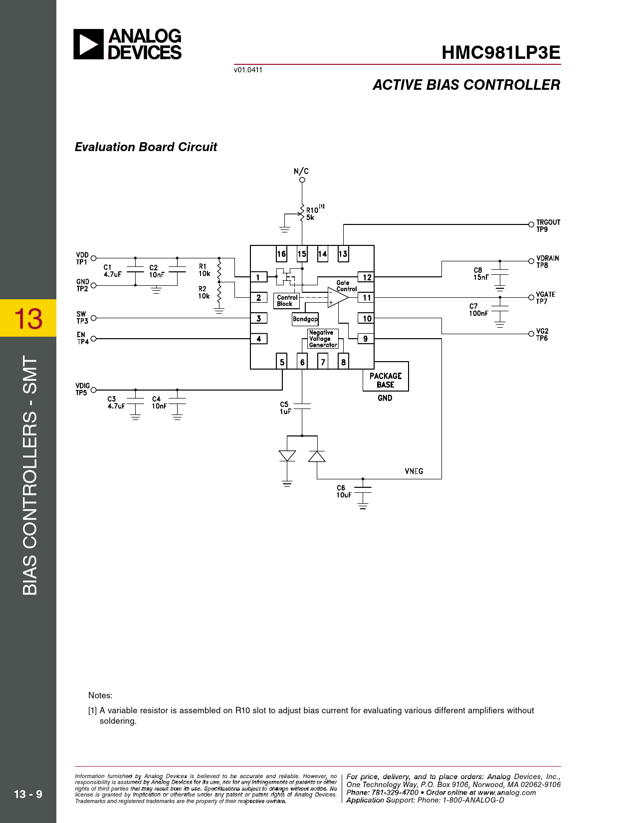 HMC981LP3E v01.0411 ACTIVE BIAS CONTROLLEREvaluation Board Circuit 13 T M S - S R LLE O R T N O S C IA B Notes: [1] A variable resistor is assembled on R10 slot to adjust bias current for evaluating various different amplifiers without soldering. Information furnish F e o d r p by A rnic alo e g , d Devi ecleis vie s rby eli, a eve nd t d to b o p e a l cc a ur c at e o e an r d d releiars ble , p . Ho le we a vesr, e c no For price, delivery, and to place orders: Analog Devices, Inc., responsibility is assumed by Analog Devices for its use, nor for any infringements of patents or other ontact Hittite Microwave Corporation: One Technology Way, P.O. Box 9106, Norwood, MA 02062-9106 2 Elizabeth Drive, Chelmsford, MA 01824 Phon rights of third parties that may result from its use. Specifications subject to change without notice. No e: 9 Ph 7 o 8 n - e 2 : 750 81- - 3 3 2 3 9- 4 4 3 F 70 ax 0 • O : 9 rde 7 r o8 nl-i2 n 50 e at -33 ww 7 w. 3 13 - 9 license is granted by implication or otherwise under any patent or patent rights of Analog Devices. analog.com Order On- Trademarks and registered trademarks are the property of their respective owners. line at www.hi A tptiptliec.actio o m n Support: Phone: 1-800-ANALOG-D