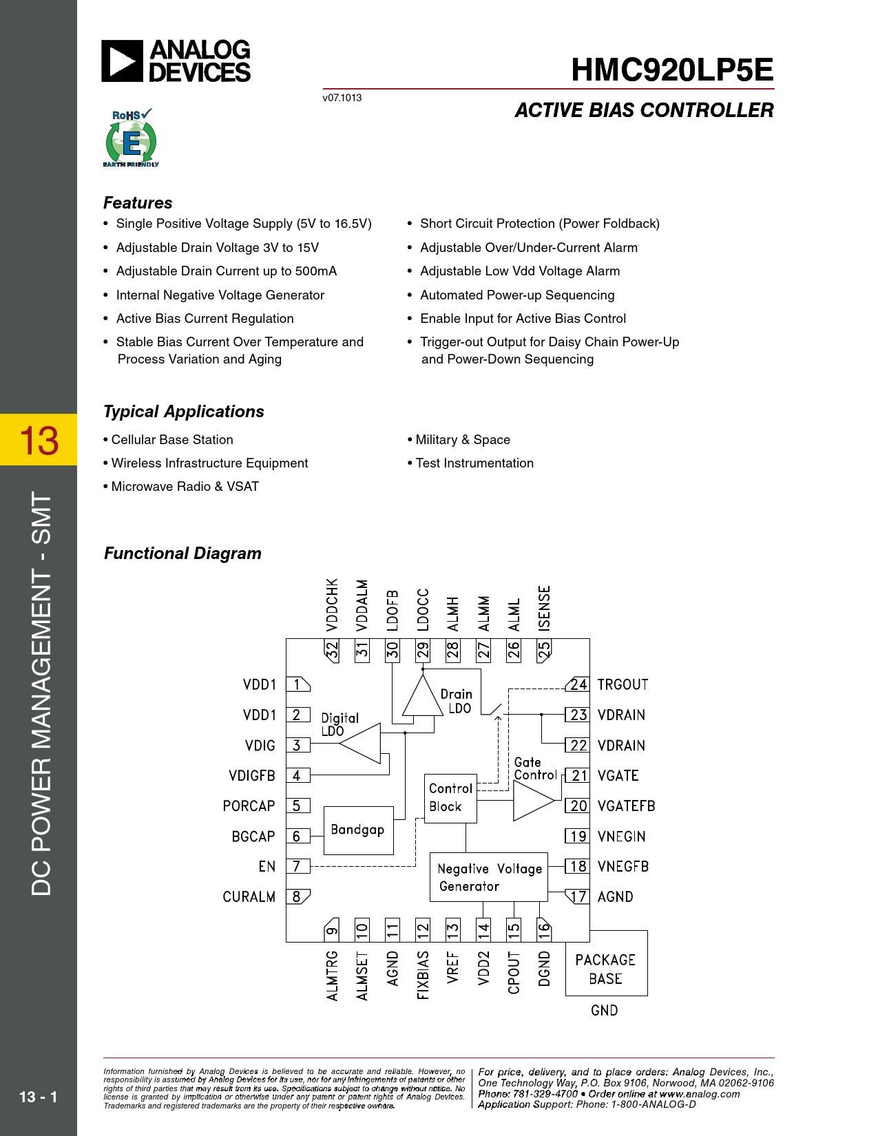 HMC920LPL 5P E5 v07.1013 ACA TIC VEV BE IAB SIA CS OC NTRT OR LLEREFeatures • Single Positive Voltage Supply (5V to 16.5V) • Short Circuit Protection (Power Foldback) • Adjustable Drain Voltage 3V to 15V • Adjustable Over/Under-Current Alarm • Adjustable Drain Current up to 500mA • Adjustable Low Vdd Voltage Alarm • Internal Negative Voltage Generator • Automated Power-up Sequencing • Active Bias Current Regulation • Enable Input for Active Bias Control • Stable Bias Current Over Temperature and • Trigger-out Output for Daisy Chain Power-Up Process Variation and Aging and Power-Down Sequencing Typical Applications 13 • Celular Base Station • Military & Space • Wireless Infrastructure Equipment • Test Instrumentation T • Microwave Radio & VSAT M Functional Diagram T - S N E M E G A N A R M E W O C P D Information furnish F e o d r p by A rnic alo e g , d Devi ecleis vie s rby eli, a eve nd t d to b o p e a l cc a ur c at e o e an r d d releiars ble , p . Ho le we a ve sr, e c no For price, delivery, and to place orders: Analog Devices, Inc., responsibility is assumed by Analog Devices for its use, nor for any infringements of patents or other ontact Hittite Microwave Corporation: One Technology Way, P.O. Box 9106, Norwood, MA 02062-9106 20 Alpha Road, Chelmsford, MA 01824 Phone rights of third parties that may result from its use. Specifications subject to change without notice. No : 9P7 h 8 o - n 2 e 5 : 7 0- 81- 3 3 3 2 4 9- 3 F 470 ax: 9 0 • Ord 7 e 8 r o - n 2 li 5 n 0 e a-t 337 ww 3 13 - 1 license is granted by implication or otherwise under any patent or patent rights of Analog Devices. w.analog.com Order On- Trademarks and registered trademarks are the property of their respective owners. line at www.hi A tptiptliec.actio o m n Support: Phone: 1-800-ANALOG-D
