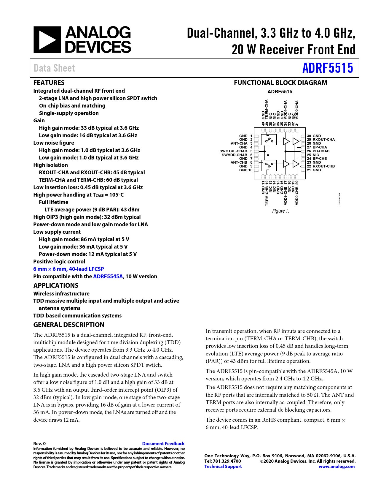 Dual-Channel, 3.3 GHz to 4.0 GHz,. 20 W Receiver Front End. Data Sheet. ADRF5515. FEATURES. FUNCTIONAL BLOCK DIAGRAM