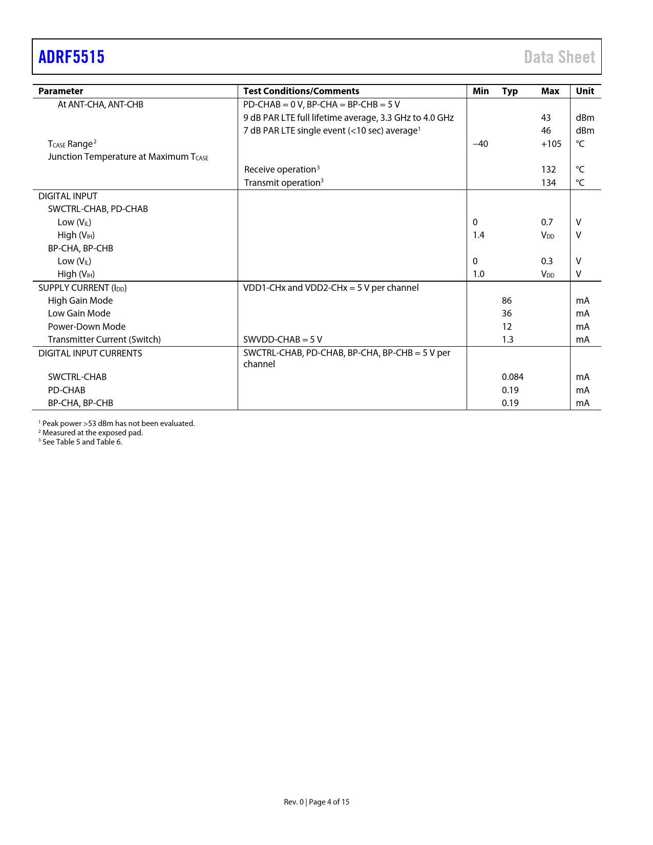 Pages / Page15 / 4 — ADRF5515. Data Sheet. Parameter. Test Conditions/Comments. Min Typ. Max. …