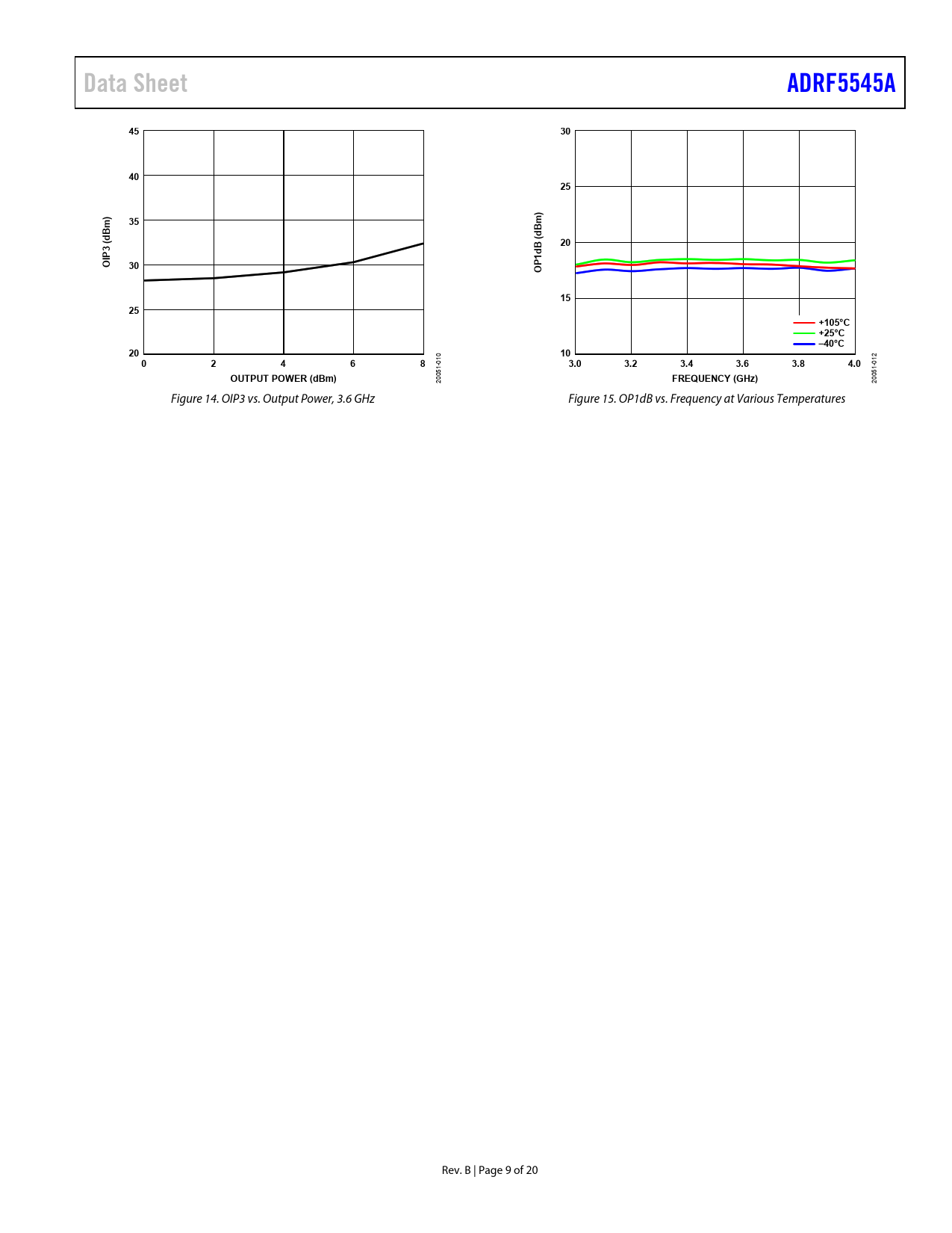 Data SheetADRF5545A4530402535dBm)dBm)20B (IP3 ( O30P1d O1525+105°C+25°C–40°C201002468 010 3.03.23.43.63.84.0 012 OUTPUT POWER (dBm) 20051- FREQUENCY (GHz) 20051- Figure 14. OIP3 vs. Output Power, 3.6 GHz Figure 15. OP1dB vs. Frequency at Various Temperatures Rev. B | Page 9 of 20 Document Outline FEATURES APPLICATIONS FUNCTIONAL BLOCK DIAGRAM GENERAL DESCRIPTION TABLE OF CONTENTS REVISION HISTORY SPECIFICATIONS ELECTRICAL SPECIFICATIONS 2.6 GHZ TUNED OPERATION ABSOLUTE MAXIMUM RATINGS THERMAL RESISTANCE ESD CAUTION PIN CONFIGURATION AND FUNCTION DESCRIPTIONS INTERFACE SCHEMATICS TYPICAL PERFORMANCE CHARACTERISTICS RECEIVE OPERATION, HIGH GAIN MODE RECEIVE OPERATION, LOW GAIN MODE TRANSMIT OPERATION RECEIVE OPERATION, HIGH GAIN MODE WITH 2.6 GHZ TUNING RECEIVE OPERATION, LOW GAIN MODE WITH 2.6 GHz TUNING TRANSMIT OPERATION AT WITH 2.6 GHz TUNING THEORY OF OPERATION SIGNAL PATH SELECT Transmit Operation Receive Operation BIASING SEQUENCE APPLICATIONS INFORMATION 2.6 GHZ OPERATION OUTLINE DIMENSIONS ORDERING GUIDE