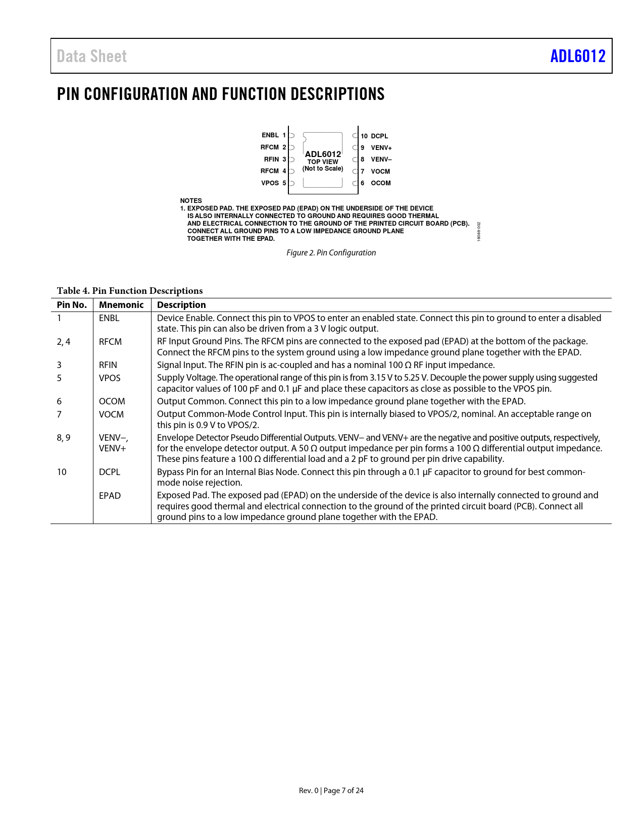 Data SheetADL6012PIN CONFIGURATION AND FUNCTION DESCRIPTIONSENBL 110 DCPLRFCM 29VENV+ADL6012RFIN 38VENV–TOP VIEWRFCM 4(Not to Scale)7VOCMVPOS 56OCOMNOTES 1. EXPOSED PAD. THE EXPOSED PAD (EPAD) ON THE UNDERSIDE OF THE DEVICE IS ALSO INTERNALLY CONNECTED TO GROUND AND REQUIRES GOOD THERMALAND ELECTRICAL CONNECTION TO THE GROUND OF THE PRINTED CIRCUIT BOARD (PCB). 002 CONNECT ALL GROUND PINS TO A LOW IMPEDANCE GROUND PLANETOGETHER WITH THE EPAD. 16086- Figure 2. Pin Configuration Table 4. Pin Function Descriptions Pin No. MnemonicDescription 1 ENBL Device Enable. Connect this pin to VPOS to enter an enabled state. Connect this pin to ground to enter a disabled state. This pin can also be driven from a 3 V logic output. 2, 4 RFCM RF Input Ground Pins. The RFCM pins are connected to the exposed pad (EPAD) at the bottom of the package. Connect the RFCM pins to the system ground using a low impedance ground plane together with the EPAD. 3 RFIN Signal Input. The RFIN pin is ac-coupled and has a nominal 100 Ω RF input impedance. 5 VPOS Supply Voltage. The operational range of this pin is from 3.15 V to 5.25 V. Decouple the power supply using suggested capacitor values of 100 pF and 0.1 µF and place these capacitors as close as possible to the VPOS pin. 6 OCOM Output Common. Connect this pin to a low impedance ground plane together with the EPAD. 7 VOCM Output Common-Mode Control Input. This pin is internally biased to VPOS/2, nominal. An acceptable range on this pin is 0.9 V to VPOS/2. 8, 9 VENV−, Envelope Detector Pseudo Differential Outputs. VENV− and VENV+ are the negative and positive outputs, respectively, VENV+ for the envelope detector output. A 50 Ω output impedance per pin forms a 100 Ω differential output impedance. These pins feature a 100 Ω differential load and a 2 pF to ground per pin drive capability. 10 DCPL Bypass Pin for an Internal Bias Node. Connect this pin through a 0.1 µF capacitor to ground for best common- mode noise rejection. EPAD Exposed Pad. The exposed pad (EPAD) on the underside of the device is also internally connected to ground and requires good thermal and electrical connection to the ground of the printed circuit board (PCB). Connect all ground pins to a low impedance ground plane together with the EPAD. Rev. 0 | Page 7 of 24 Document Outline FEATURES APPLICATIONS FUNCTIONAL BLOCK DIAGRAM GENERAL DESCRIPTION TABLE OF CONTENTS REVISION HISTORY SPECIFICATIONS ABSOLUTE MAXIMUM RATINGS THERMAL RESISTANCE ESD CAUTION PIN CONFIGURATION AND FUNCTION DESCRIPTIONS TYPICAL PERFORMANCE CHARACTERISTICS MEASUREMENT SETUPS THEORY OF OPERATION BASIC CONNECTIONS RF INPUT ENVELOPE OUTPUT INTERFACE COMMON-MODE VOLTAGE INTERFACE ENABLE INTERFACE DECOUPLING INTERFACE PCB LAYOUT RECOMMENDATIONS SYSTEM CALIBRATION AND MEASUREMENT ERROR APPLICATIONS INFORMATION EVALUATION BOARD OUTLINE DIMENSIONS ORDERING GUIDE