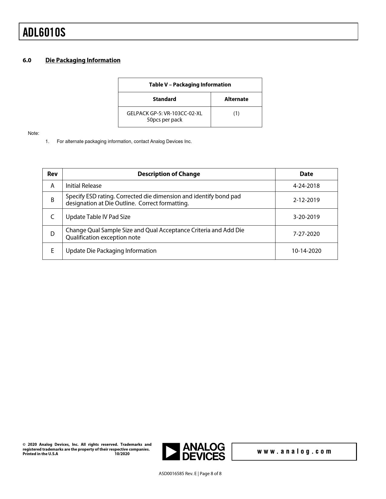 | Pages / Page | 8 / 8 — ADL6010S. 6.0. Die Packaging Information. Table V – Packaging … |