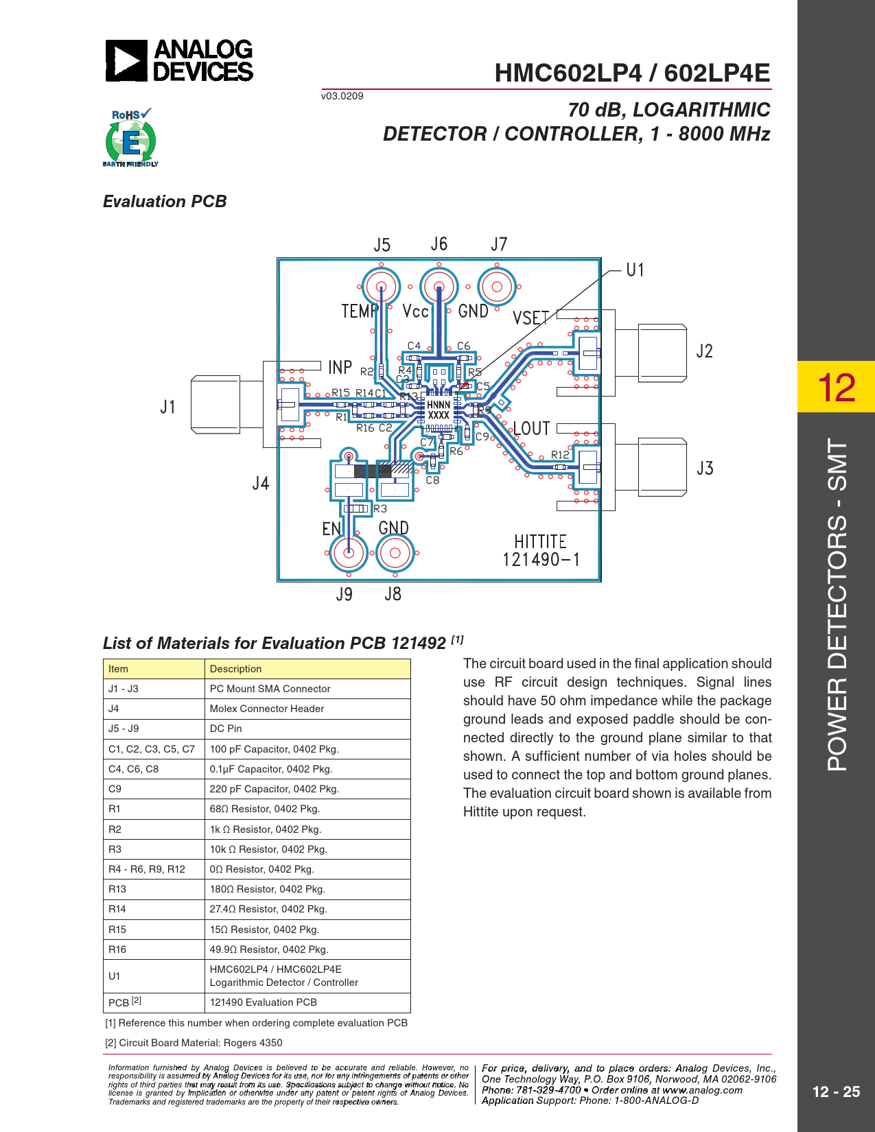 HMC602LP4 / 602LP4E v03.0209 70 dB, LOGARITHMICDETECTOR / CONTROLLER, 1 - 8000 MHzEvaluation PCB 12 T S - SM R O T C E T List of Materials for Evaluation PCB 121492 [1] E The circuit board used in the fi nal application should Item Description use RF circuit design techniques. Signal lines J1 - J3 PC Mount SMA Connector R D should have 50 ohm impedance while the package J4 Molex Connector Header E ground leads and exposed paddle should be con- J5 - J9 DC Pin W nected directly to the ground plane similar to that C1, C2, C3, C5, C7 100 pF Capacitor, 0402 Pkg. O shown. A sufficient number of via holes should be C4, C6, C8 0.1μF Capacitor, 0402 Pkg. P used to connect the top and bottom ground planes. C9 220 pF Capacitor, 0402 Pkg. The evaluation circuit board shown is available from R1 68Ω Resistor, 0402 Pkg. Hittite upon request. R2 1k Ω Resistor, 0402 Pkg. R3 10k Ω Resistor, 0402 Pkg. R4 - R6, R9, R12 0Ω Resistor, 0402 Pkg. R13 180Ω Resistor, 0402 Pkg. R14 27.4Ω Resistor, 0402 Pkg. R15 15Ω Resistor, 0402 Pkg. R16 49.9Ω Resistor, 0402 Pkg. HMC602LP4 / HMC602LP4E U1 Logarithmic Detector / Controller PCB [2] 121490 Evaluation PCB [1] Reference this number when ordering complete evaluation PCB [2] Circuit Board Material: Rogers 4350 Information furnis F heod r pri by An ce, de alog Devi lcievs eir s y b , a eliev nd to pla ed to be accu ce o rate anrder d relia sbl, pl e. H ease co owever, no For price, delivery, and to place orders: Analog Devices, Inc., responsibility is assumed by Analog Devices for its use, nor for any infringements of patents or other ntact Hittite Microwave Corporation: One Technology Way, P.O. Box 9106, Norwood, MA 02062-9106 20 Alpha Road, Chelmsford, MA 01824 Phone: 978 rights of third parties that may result from its use. Specifications subject to change without notice. No Ph - o 25 ne 0 : 7 -3 81- 3 3 4 29 3 F -470 ax: 978 0 • Orde - r o 25 nlin 0- e a3 t 373 license is granted by implication or otherwise under any patent or patent rights of Analog Devices. www.analog.com 12 - 25 Order On-l Trademarks and registered trademarks are the property of their respective owners. ine at www.hit A ti p te.co plicati m on Support: Phone: 1-800-ANALOG-D