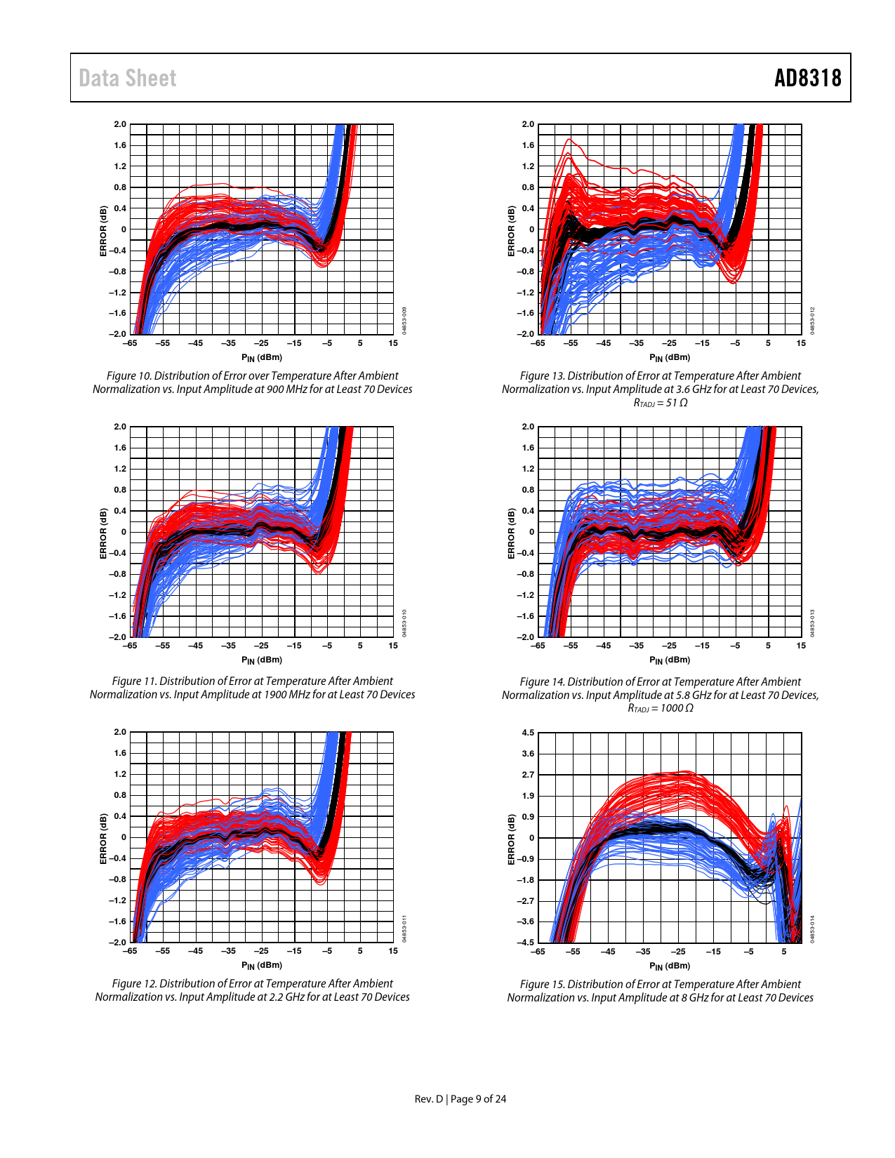 Data SheetAD83182.02.01.61.61.21.20.80.80.4B)0.4B)ddR (0R (0RRO –0.4RROE–0.4E–0.8–0.8–1.2–1.2–1.6 09 12 0 –1.6 0 3- 3- 85 85 –2.0 04 –2.0 04 –65–55–45–35–25–15–5515–65–55–45–35–25–15–5515PIN (dBm)PIN (dBm) Figure 10. Distribution of Error over Temperature After Ambient Figure 13. Distribution of Error at Temperature After Ambient Normalization vs. Input Amplitude at 900 MHz for at Least 70 Devices Normalization vs. Input Amplitude at 3.6 GHz for at Least 70 Devices, RTADJ = 51 Ω 2.02.01.61.61.21.20.80.80.4B)0.4B)ddR (0R (0RRO –0.4RROE–0.4E–0.8–0.8–1.2–1.2–1.6 10 13 0 –1.6 0 3- 3- 85 85 –2.0 04 –2.0 04 –65–55–45–35–25–15–5515–65–55–45–35–25–15–5515PIN (dBm)PIN (dBm) Figure 11. Distribution of Error at Temperature After Ambient Figure 14. Distribution of Error at Temperature After Ambient Normalization vs. Input Amplitude at 1900 MHz for at Least 70 Devices Normalization vs. Input Amplitude at 5.8 GHz for at Least 70 Devices, RTADJ = 1000 Ω 2.04.51.63.61.22.70.81.90.4B)0.9B)ddR (0R (0RRO –0.4RROE–0.9E–0.8–1.8–1.2–2.7–1.6 11 14 0 –3.6 0 3- 3- 85 85 –2.0 04 –4.5 04 –65–55–45–35–25–15–5515–65–55–45–35–25–15–55PIN (dBm)PIN (dBm) Figure 12. Distribution of Error at Temperature After Ambient Figure 15. Distribution of Error at Temperature After Ambient Normalization vs. Input Amplitude at 2.2 GHz for at Least 70 Devices Normalization vs. Input Amplitude at 8 GHz for at Least 70 Devices Rev. D | Page 9 of 24 Document Outline Features Applications Functional Block Diagram General Description Revision History Specifications Absolute Maximum Ratings ESD Caution Pin Configuration and Function Descriptions Typical Performance Characteristics Theory of Operation Using the AD8318 Basic Connections Enable Interface Input Signal Coupling Output Interface Setpoint Interface Temperature Compensation of Output Voltage Temperature Sensor Measurement Mode Device Calibration and Error Calculation Selecting Calibration Points to Improve Accuracy over a Reduced Range Variation in Temperature Drift from Device to Device Temperature Drift at Different Temperatures Setting the Output Slope in Measurement Mode Response Time Capability Output Filtering Controller Mode Characterization Setup and Methods Evaluation Board Outline Dimensions Ordering Guide