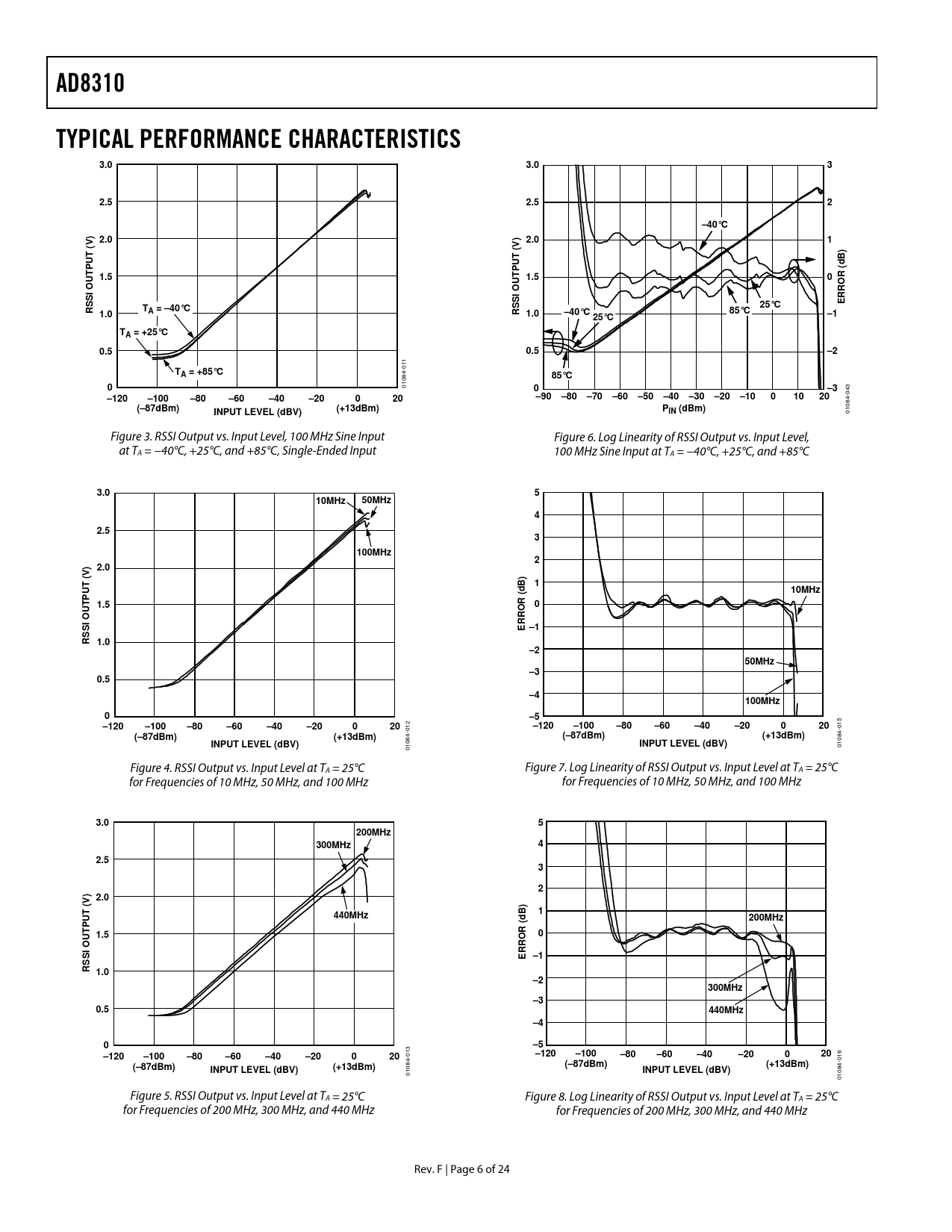 AD8310TYPICAL PERFORMANCE CHARACTERISTICS3.03.032.52.52–40°C))V 2.02.01(VT( TTPU 1.5TPU 1.50RROR (dB)SSI OUESSI OU25°CRT1.0A = –40°CR 1.0–40°C85°C–125°CTA = +25°C0.50.5–2TA = +85°C85°C0 01084-011 0–3–120–100–80–60–40–20020–90–80–70–60–50–40–30–20–1001020(–87dBm)INPUT LEVEL (dBV)(+13dBm)PIN (dBm) 01084-043 Figure 3. RSSI Output vs. Input Level, 100 MHz Sine Input Figure 6. Log Linearity of RSSI Output vs. Input Level, at TA = −40°C, +25°C, and +85°C, Single-Ended Input 100 MHz Sine Input at TA = −40°C, +25°C, and +85°C 3.0510MHz50MHz42.53100MHz2) 2.01UT (V10MHz1.50I OUTPRROR (dB)SE –1RS 1.0–250MHz–30.5–4100MHz0–5–120–100–80–60–40–20020–120–100–80–60–40–20020(–87dBm)(+13dBm)(–87dBm)(+13dBm)INPUT LEVEL (dBV)INPUT LEVEL (dBV) 01084-015 01084-012 Figure 4. RSSI Output vs. Input Level at TA = 25°C Figure 7. Log Linearity of RSSI Output vs. Input Level at TA = 25°C for Frequencies of 10 MHz, 50 MHz, and 100 MHz for Frequencies of 10 MHz, 50 MHz, and 100 MHz 3.05200MHz300MHz42.532) V 2.0( T440MHz1200MHzTPU 1.50RROR (dB) E –1SSI OU R 1.0–2300MHz–30.5440MHz–40–5–120–100–80–60–40–20020–120–100–80–60–40–20020(–87dBm)(–87dBm)(+13dBm)INPUT LEVEL (dBV)(+13dBm)INPUT LEVEL (dBV) 01084-013 01084-016 Figure 5. RSSI Output vs. Input Level at TA = 25°C Figure 8. Log Linearity of RSSI Output vs. Input Level at TA = 25°C for Frequencies of 200 MHz, 300 MHz, and 440 MHz for Frequencies of 200 MHz, 300 MHz, and 440 MHz Rev. F | Page 6 of 24 Document Outline FEATURES APPLICATIONS FUNCTIONAL BLOCK DIAGRAM GENERAL DESCRIPTION TABLE OF CONTENTS REVISION HISTORY SPECIFICATIONS ABSOLUTE MAXIMUM RATINGS ESD CAUTION PIN CONFIGURATION AND FUNCTION DESCRIPTIONS TYPICAL PERFORMANCE CHARACTERISTICS THEORY OF OPERATION PROGRESSIVE COMPRESSION SLOPE AND INTERCEPT CALIBRATION OFFSET CONTROL PRODUCT OVERVIEW ENABLE INTERFACE INPUT INTERFACE OFFSET INTERFACE OUTPUT INTERFACE USING THE AD8310 BASIC CONNECTIONS TRANSFER FUNCTION IN TERMS OF SLOPE AND INTERCEPT dBV vs. dBm INPUT MATCHING NARROW-BAND MATCHING GENERAL MATCHING PROCEDURE Step 1: Tune Out CIN Step 2: Calculate CO and LO Step 3: Split CO into Two Parts Step 4: Calculate LM SLOPE AND INTERCEPT ADJUSTMENTS INCREASING THE SLOPE TO A FIXED VALUE OUTPUT FILTERING LOWERING THE HIGH-PASS CORNER FREQUENCY OF THE OFFSET COMPENSATION LOOP APPLICATIONS INFORMATION CABLE-DRIVING DC-COUPLED INPUT EVALUATION BOARD DIE INFORMATION OUTLINE DIMENSIONS ORDERING GUIDE