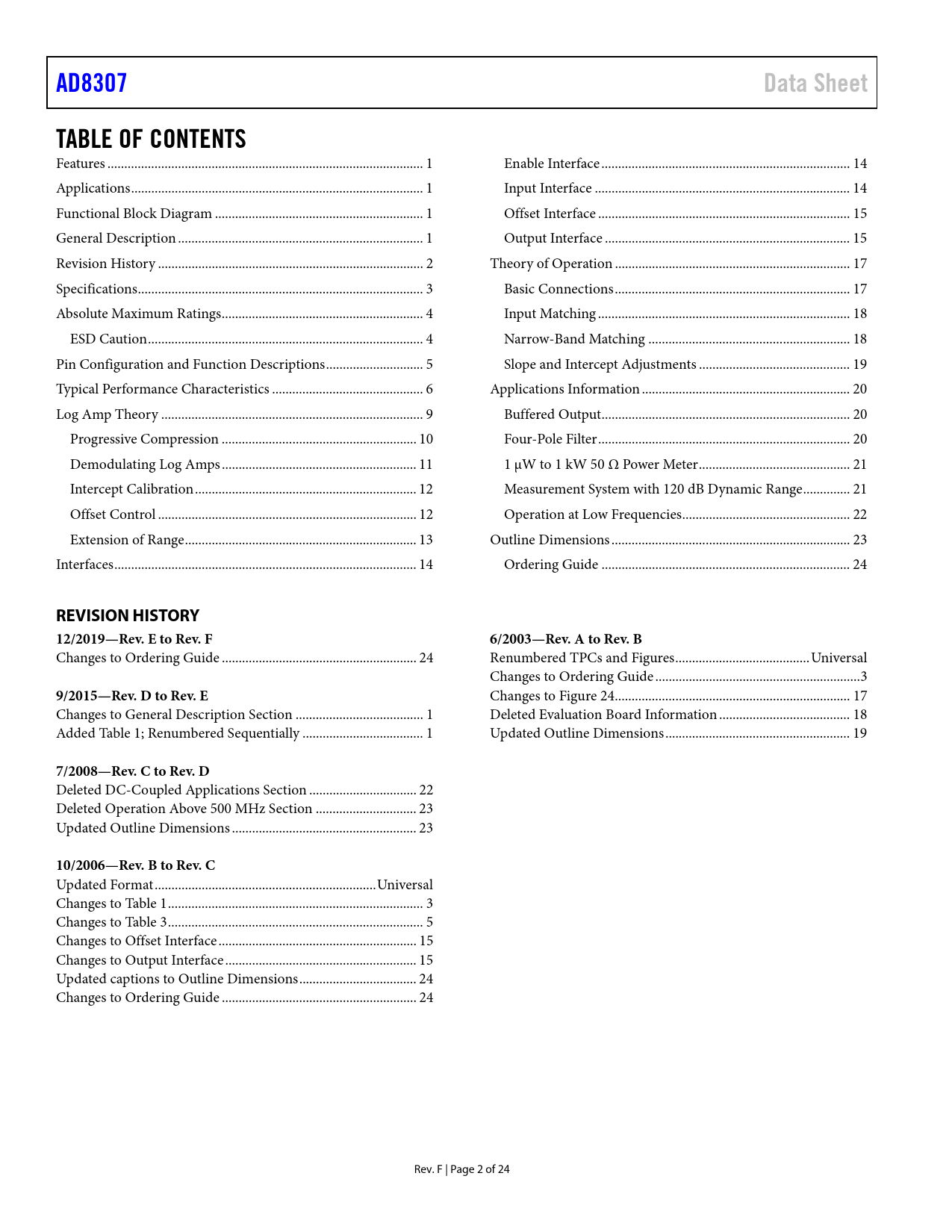 Pages / Page24 / 2 — AD8307. Data Sheet. TABLE OF CONTENTS. REVISION HISTORY. 12/2019—Rev. E …