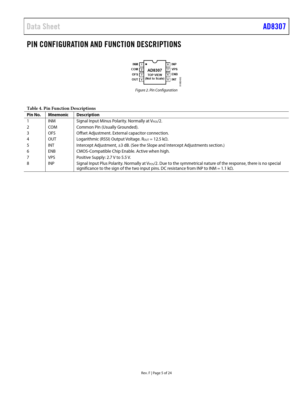Pages / Page24 / 5 — Data Sheet. AD8307. PIN CONFIGURATION AND FUNCTION DESCRIPTIONS. INM 1. …