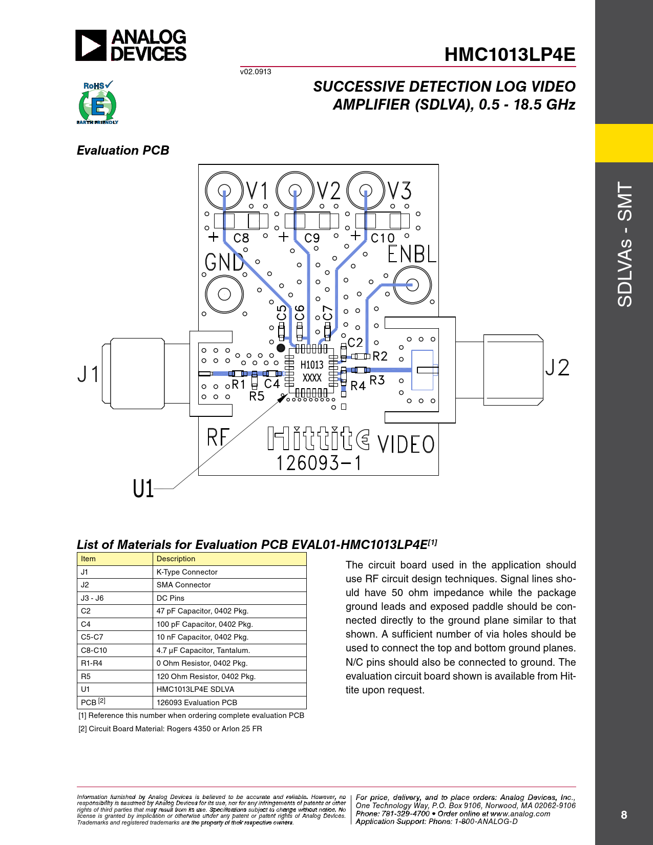 HMC1013LP4E. SUCCESSIVE DETECTION LOG VIDEO. AMPLIFIER (SDLVA), 0.5 - 18.5 GHz. Evaluation PCB