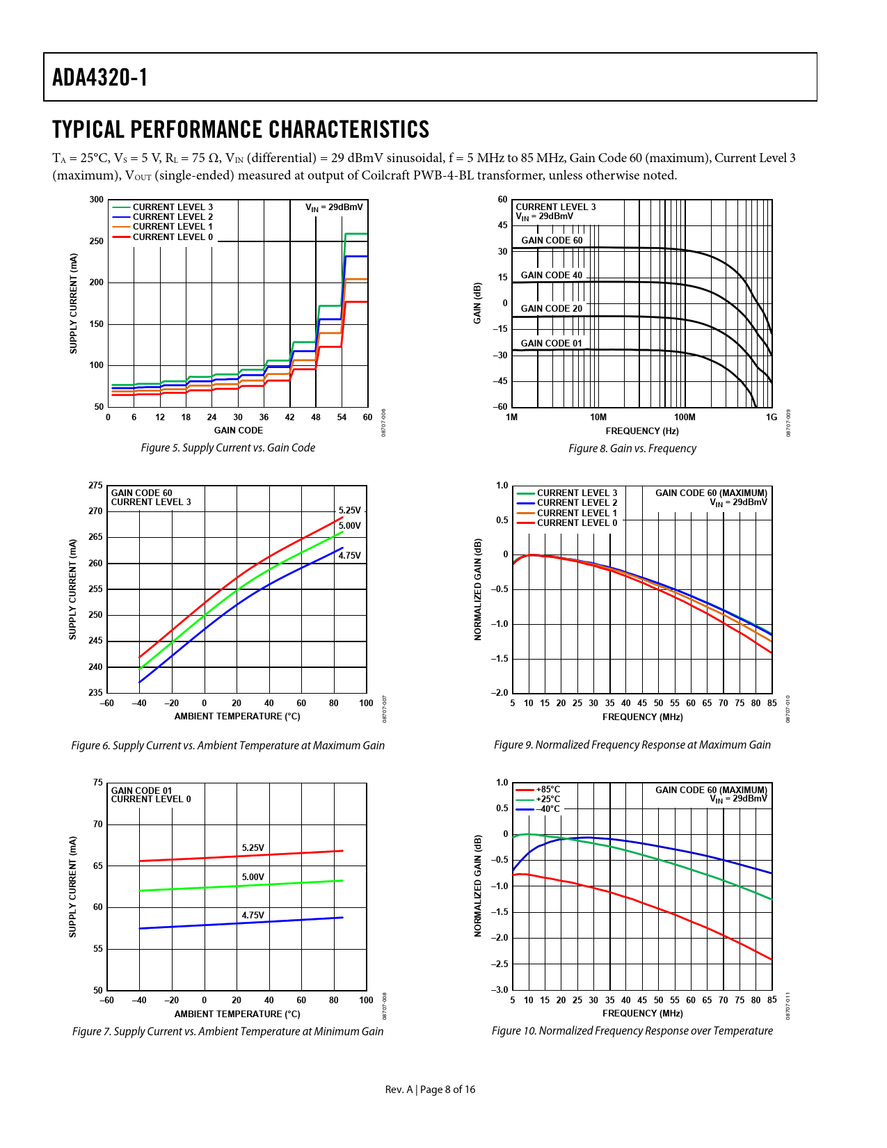 ADA4320-1 TYPICAL PERFORMANCE CHARACTERISTICS TA = 25°C, VS = 5 V, RL = 75 Ω, VIN (differential) = 29 dBmV sinusoidal, f = 5 MHz to 85 MHz, Gain Code 60 (maximum), Current Level 3 (maximum), VOUT (single-ended) measured at output of Coilcraft PWB-4-BL transformer, unless otherwise noted.
