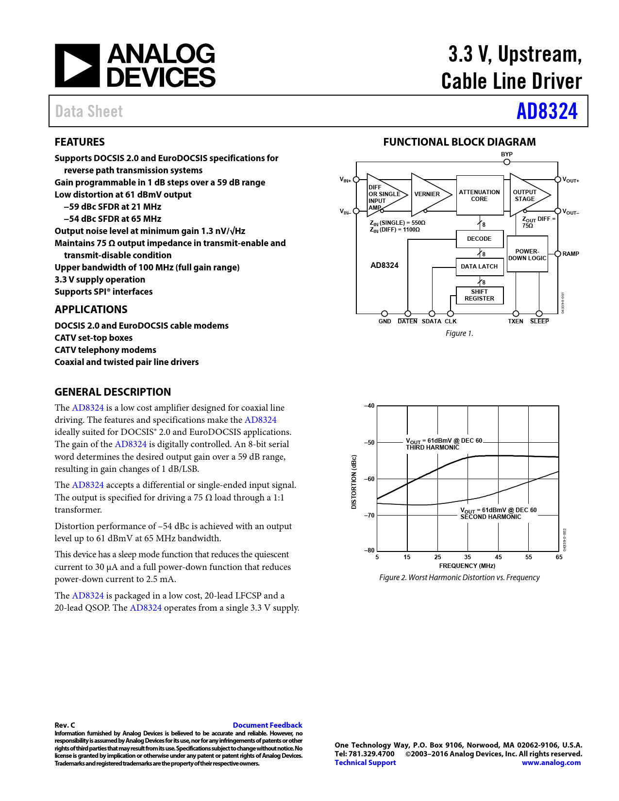 | Pages / Page | 16 / 1 — 3.3 V, Upstream,. Cable Line Driver. Data Sheet. AD8324. FEATURES. … |