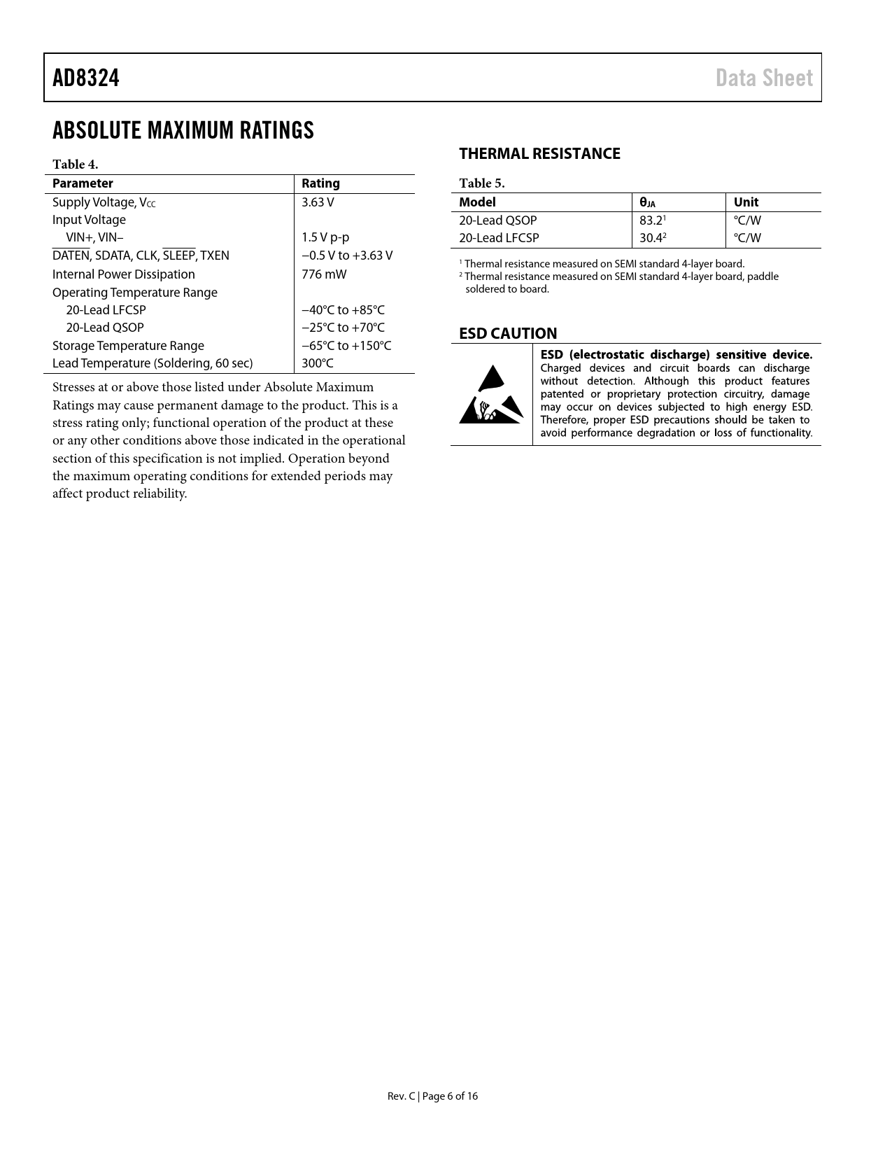 AD8324 Data Sheet ABSOLUTE MAXIMUM RATINGS THERMAL RESISTANCE Table 4 Parameter Rating Table 5 Model θJA Unit ESD CAUTION