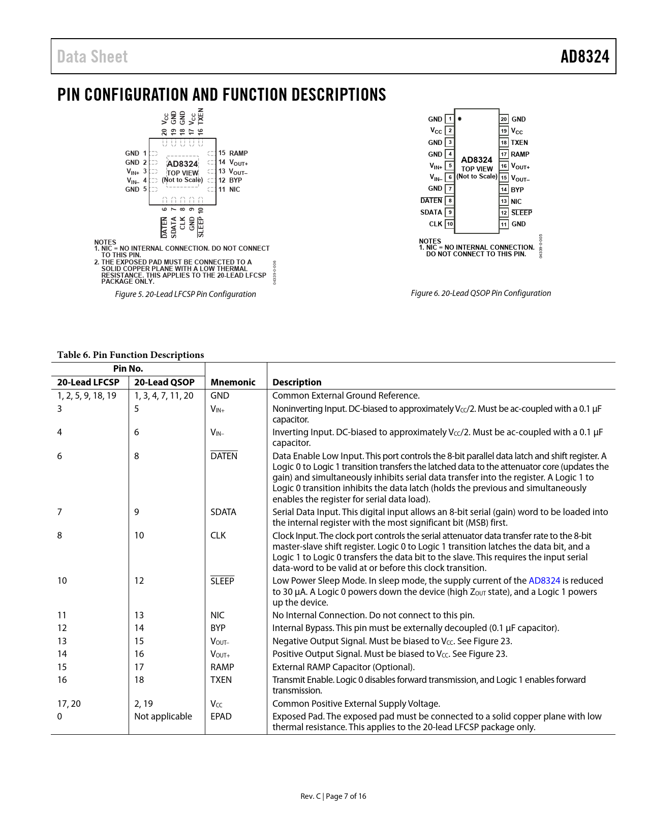Table 6. Pin Function Descriptions Pin No. 20-Lead LFCSP 20-Lead QSOP Mnemonic Description