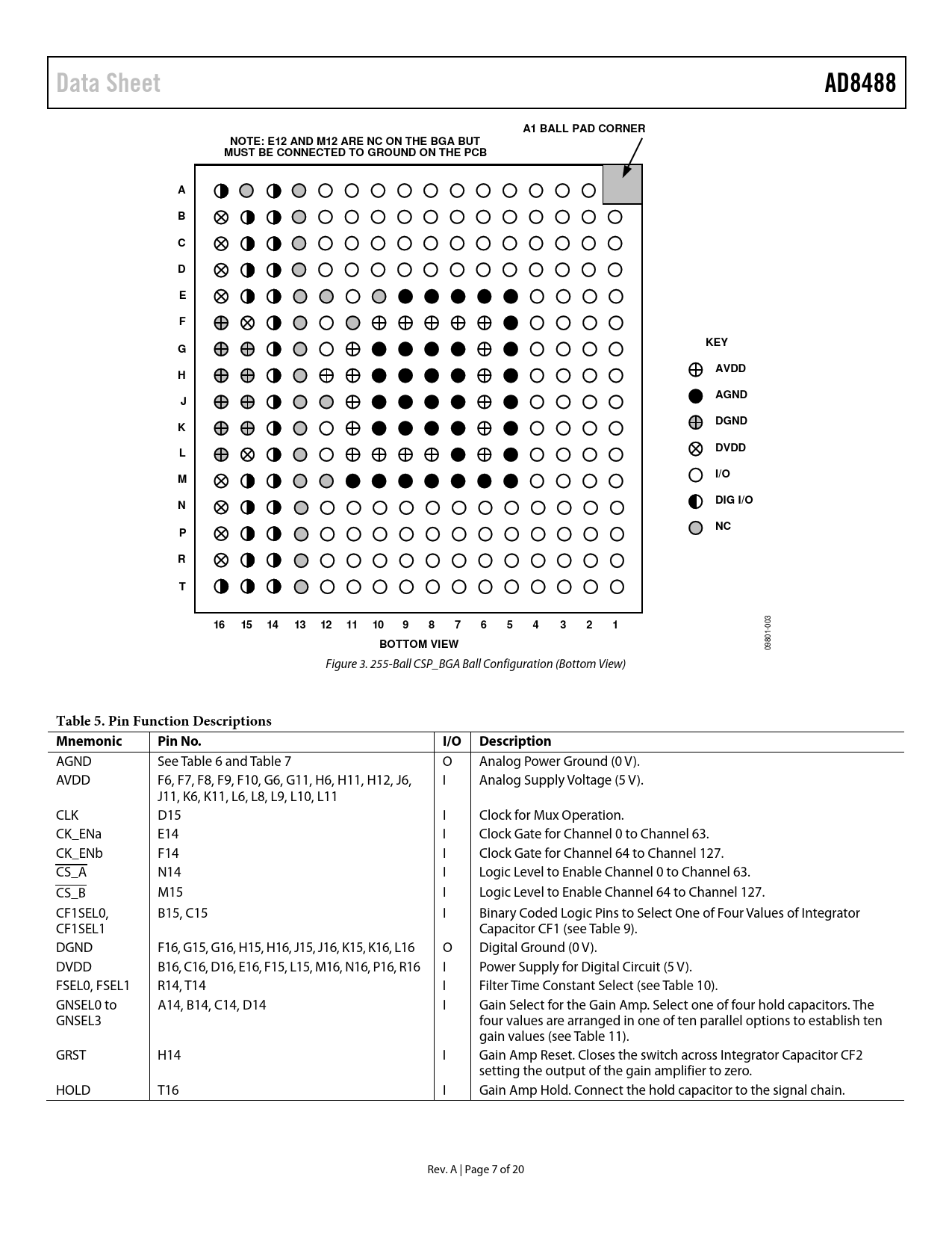 link to page 9 link to page 10 link to page 16 link to page 16 link to page 16 Data SheetAD8488A1 BALL PAD CORNERNOTE: E12 AND M12 ARE NC ON THE BGA BUTMUST BE CONNECTED TO GROUND ON THE PCBABCDEFKEYGAVDDHAGNDJDGNDKDVDDLI/OMDIG I/ONNCPRT16151413121110987654321 003 BOTTOM VIEW 09801- Figure 3. 255-Ball CSP_BGA Ball Configuration (Bottom View) Table 5. Pin Function Descriptions MnemonicPin No.I/O Description AGND See Table 6 and Table 7 O Analog Power Ground (0 V). AVDD F6, F7, F8, F9, F10, G6, G11, H6, H11, H12, J6, I Analog Supply Voltage (5 V). J11, K6, K11, L6, L8, L9, L10, L11 CLK D15 I Clock for Mux Operation. CK_ENa E14 I Clock Gate for Channel 0 to Channel 63. CK_ENb F14 I Clock Gate for Channel 64 to Channel 127. CS_A N14 I Logic Level to Enable Channel 0 to Channel 63. CS_B M15 I Logic Level to Enable Channel 64 to Channel 127. CF1SEL0, B15, C15 I Binary Coded Logic Pins to Select One of Four Values of Integrator CF1SEL1 Capacitor CF1 (see Table 9). DGND F16, G15, G16, H15, H16, J15, J16, K15, K16, L16 O Digital Ground (0 V). DVDD B16, C16, D16, E16, F15, L15, M16, N16, P16, R16 I Power Supply for Digital Circuit (5 V). FSEL0, FSEL1 R14, T14 I Filter Time Constant Select (see Table 10). GNSEL0 to A14, B14, C14, D14 I Gain Select for the Gain Amp. Select one of four hold capacitors. The GNSEL3 four values are arranged in one of ten parallel options to establish ten gain values (see Table 11). GRST H14 I Gain Amp Reset. Closes the switch across Integrator Capacitor CF2 setting the output of the gain amplifier to zero. HOLD T16 I Gain Amp Hold. Connect the hold capacitor to the signal chain. Rev. A | Page 7 of 20 Document Outline Features Application General Description Functional Block Diagram Table of Contents Revision History Specifications Absolute Maximum Ratings Thermal Data Thermal Characterization ESD Caution Pin Configuration and Function Descriptions Signal Mnemonics Typical Performance Characteristics Theory of Operation Overview Analog Amplifier Troubleshooting Channels Timing Signals Timing Notes Applications Information Control Register Bit Maps Timing Diagrams Outline Dimensions Ordering Guide