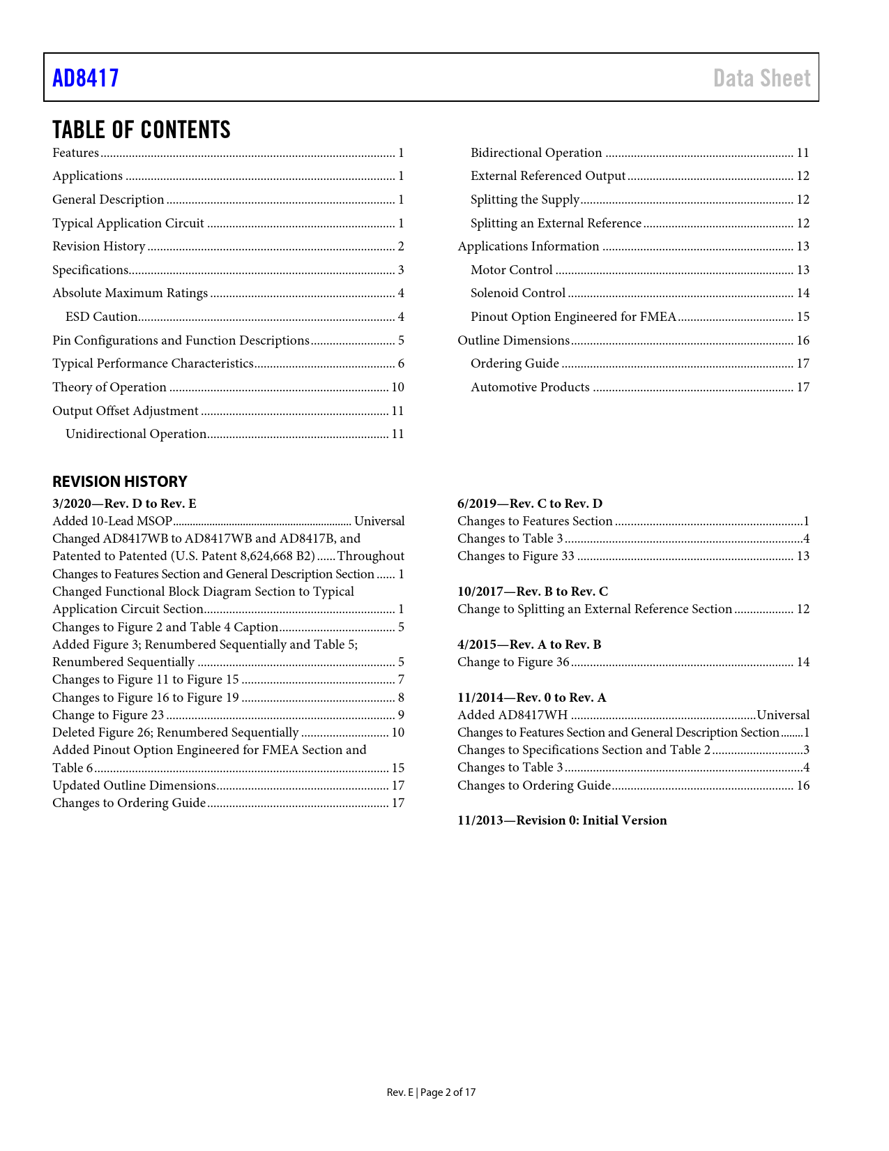 AD8417 Data Sheet TABLE OF CONTENTS REVISION HISTORY 3/2020—Rev D to Rev E 6/2019—Rev C to Rev D