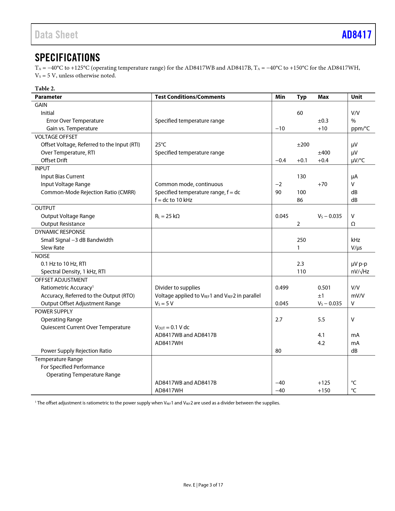 Data Sheet. AD8417. SPECIFICATIONS. Table 2. Parameter. Test Conditions/Comments. Min. Typ. Max. Unit