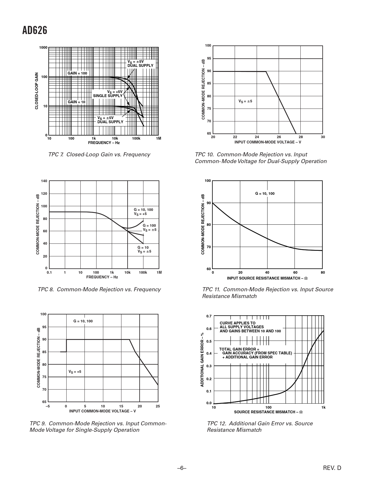 AD626. 100. 1000. VS =. DUAL SUPPLY. GAIN = 100. VS = +5V. SINGLE SUPPLY. GAIN = 10. CLOSED-LOOP GAIN. COMMON-MODE REJECTION – dB. 010. 10k. 100k