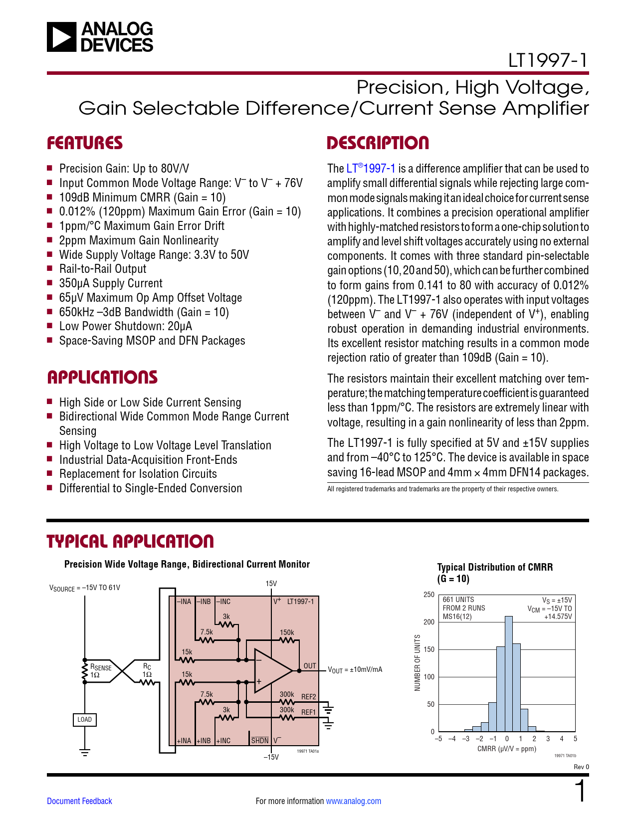 LT1997-1 Precision, High Voltage, Gain Selectable Difference/Current Sense Amplifier FEATURESDESCRIPTION n Precision Gain: Up to 80V/V The LT®1997-1 is a difference amplifier that can be used to n Input Common Mode Voltage Range: V– to V– + 76V amplify small differential signals while rejecting large com- n 109dB Minimum CMRR (Gain = 10) mon mode signals making it an ideal choice for current sense n 0.012% (120ppm) Maximum Gain Error (Gain = 10) applications. It combines a precision operational amplifier n 1ppm/°C Maximum Gain Error Drift with highly-matched resistors to form a one-chip solution to n 2ppm Maximum Gain Nonlinearity amplify and level shift voltages accurately using no external n Wide Supply Voltage Range: 3.3V to 50V components. It comes with three standard pin-selectable n Rail-to-Rail Output gain options (10, 20 and 50), which can be further combined n 350µA Supply Current to form gains from 0.141 to 80 with accuracy of 0.012% n 65µV Maximum Op Amp Offset Voltage (120ppm). The LT1997-1 also operates with input voltages n 650kHz –3dB Bandwidth (Gain = 10) between V– and V– + 76V (independent of V+), enabling n Low Power Shutdown: 20µA robust operation in demanding industrial environments. n Space-Saving MSOP and DFN Packages Its excellent resistor matching results in a common mode rejection ratio of greater than 109dB (Gain = 10). APPLICATIONS The resistors maintain their excellent matching over tem- perature; the matching temperature coefficient is guaranteed n High Side or Low Side Current Sensing less than 1ppm/°C. The resistors are extremely linear with n Bidirectional Wide Common Mode Range Current voltage, resulting in a gain nonlinearity of less than 2ppm. Sensing n High Voltage to Low Voltage Level Translation The LT1997-1 is fully specified at 5V and ±15V supplies n Industrial Data-Acquisition Front-Ends and from –40°C to 125°C. The device is available in space n Replacement for Isolation Circuits saving 16-lead MSOP and 4mm × 4mm DFN14 packages. n Differential to Single-Ended Conversion All registered trademarks and trademarks are the property of their respective owners. TYPICAL APPLICATIONPrecision Wide Voltage Range, Bidirectional Current MonitorTypical Distribution of CMRR(G = 10) 15V VSOURCE = –15V TO 61V 250 –INA –INB –INC V+ LT1997-1 661 UNITS VS = ±15V FROM 2 RUNS VCM = –15V TO 3k MS16(12) +14.575V 200 7.5k 150k 15k – 150 R R OUT SENSE C V 1Ω 1Ω 15k OUT = ±10mV/mA + 100 NUMBER OF UNITS 7.5k 300k REF2 50 3k 300k REF1 LOAD 0 +INA +INB +INC SHDN V– –5 –4 –3 –2 –1 0 1 2 3 4 5 CMRR (µV/V = ppm) 19971 TA01a –15V 19971 TA01b Rev 0 Document Feedback For more information www.analog.com 1 Document Outline Features Applications Typical Application Description Absolute Maximum Ratings Pin Configuration Order Information Electrical Characteristics Typical Performance Characteristics Block Diagram Applications Information Package Description Typical Application Related Parts Features Applications Typical Application Description Absolute Maximum Ratings Pin Configuration Order Information Electrical Characteristics Typical Performance Characteristics Pin Functions Block Diagram Applications Information Package Description Typical Application Related Parts
