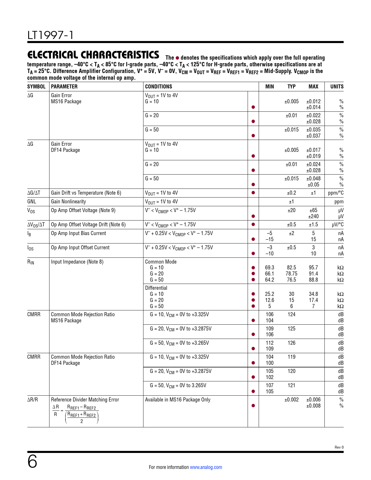 denotes the specifications which apply over the full operating temperature range, –40°C < TA < 85°C for I-grade parts, –40°C < TA < 125°C for H-grade parts, otherwise specifications are at TA = 25°C. Difference Amplifier Configuration, V+ = 5V, V– = 0V, VCM = VOUT = VREF = VREF1 = VREF2 = Mid-Supply. VCMOP is the common mode voltage of the internal op amp. SYMBOL PARAMETER CONDITIONS MIN TYP MAX UNITS