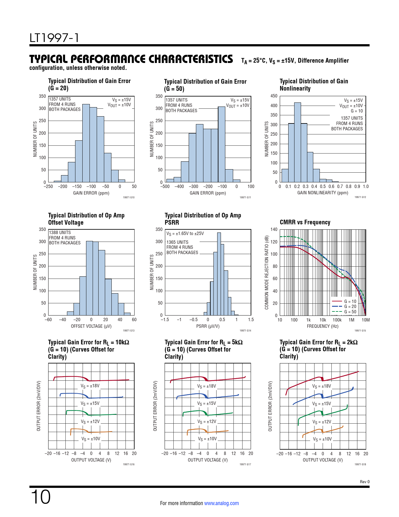 LT1997-1 TYPICAL PERFORMANCE CHARACTERISTICSTA = 25°C, VS = ±15V, Difference Amplifierconfiguration, unless otherwise noted.Typical Distribution of Gain ErrorTypical Distribution of Gain ErrorTypical Distribution of Gain(G = 20)(G = 50)Nonlinearity 350 350 450 1357 UNITS VS = ±15V 1357 UNITS VS = ±15V V FROM 4 RUNS S = ±15V VOUT = ±10V FROM 4 RUNS V 400 V 300 OUT = ±10V BOTH PACKAGES 300 OUT = ±10V BOTH PACKAGES G = 10 350 250 250 1357 UNITS FROM 4 RUNS 300 BOTH PACKAGES 200 200 250 150 150 200 NUMBER OF UNITS 150 100 NUMBER OF UNITS 100 NUMBER OF UNITS 100 50 50 50 0 0 0 –250 –200 –150 –100 –50 0 50 –500 –400 –300 –200 –100 0 100 0 0.1 0.2 0.3 0.4 0.5 0.6 0.7 0.8 0.9 1.0 GAIN ERROR (ppm) GAIN ERROR (ppm) GAIN NONLINEARITY (ppm) 19971 G10 19971 G11 19971 G12 Typical Distribution of Op AmpTypical Distribution of Op AmpOffset VoltagePSRRCMRR vs Frequency 350 350 140 1388 UNITS VS = ±1.65V to ±25V FROM 4 RUNS 300 BOTH PACKAGES 300 1365 UNITS 120 FROM 4 RUNS TIO (dB) 250 BOTH PACKAGES 250 100 200 200 80 150 150 60 NUMBER OF UNITS 100 NUMBER OF UNITS 100 40 50 50 G = 10 20 G = 20 COMMON MODE REJECTION RA G = 50 0 0 0 –60 –40 –20 0 20 40 60 –1.5 –1 –0.5 0 0.5 1 1.5 10 100 1k 10k 100k 1M 10M OFFSET VOLTAGE (µV) PSRR (µV/V) FREQUENCY (Hz) 19971 G13 19971 G14 19971 G15 Typical Gain Error for RL = 10kΩTypical Gain Error for RL = 5kΩTypical Gain Error for RL = 2kΩ(G = 10) (Curves Offset for(G = 10) (Curves Offset for(G = 10) (Curves Offset forClarity)Clarity)Clarity) VS = ±18V /DIV) VS = ±18V /DIV) VS = ±18V /DIV) VS = ±15V VS = ±15V VS = ±15V VS = ±12V VS = ±12V VS = ±12V OUTPUT ERROR (2mV OUTPUT ERROR (2mV OUTPUT ERROR (2mV VS = ±10V VS = ±10V VS = ±10V –20 –16 –12 –8 –4 0 4 8 12 16 20 –20 –16 –12 –8 –4 0 4 8 12 16 20 –20 –16 –12 –8 –4 0 4 8 12 16 20 OUTPUT VOLTAGE (V) OUTPUT VOLTAGE (V) OUTPUT VOLTAGE (V) 19971 G16 19971 G17 19971 G18 Rev 0 10 For more information www.analog.com Document Outline Features Applications Typical Application Description Absolute Maximum Ratings Pin Configuration Order Information Electrical Characteristics Typical Performance Characteristics Block Diagram Applications Information Package Description Typical Application Related Parts Features Applications Typical Application Description Absolute Maximum Ratings Pin Configuration Order Information Electrical Characteristics Typical Performance Characteristics Pin Functions Block Diagram Applications Information Package Description Typical Application Related Parts