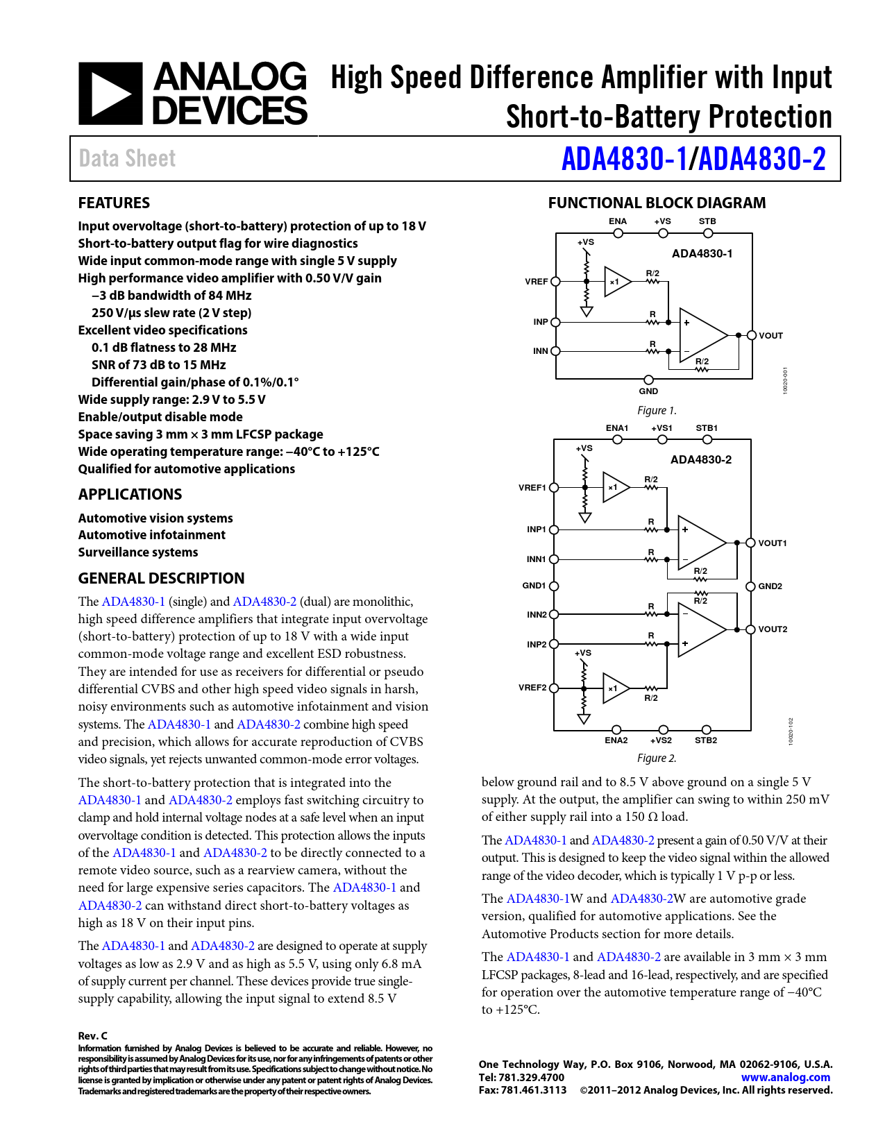 High Speed Difference Amplifier with Input. Short-to-Battery Protection. Data Sheet. ADA4830-1/. ADA4830-2. FEATURES