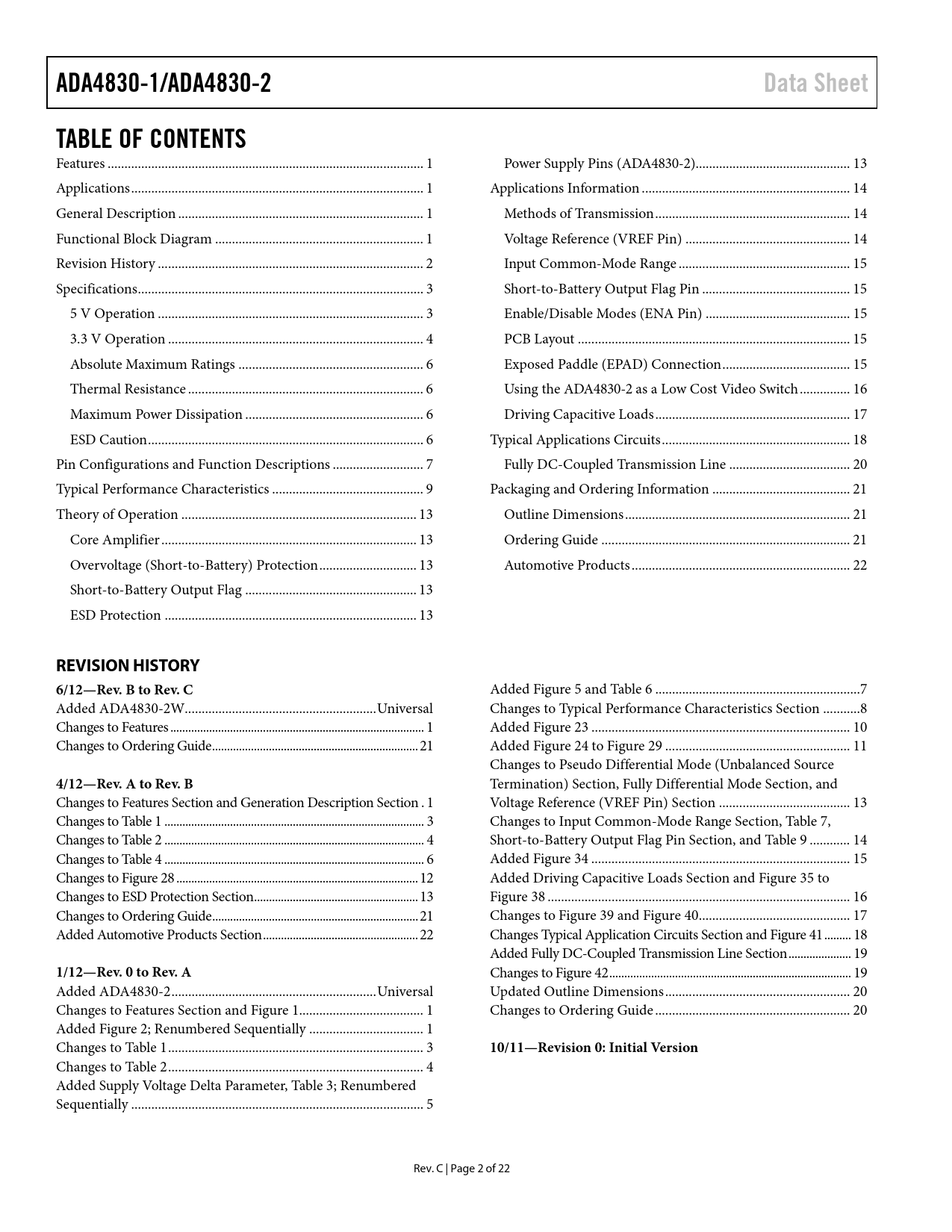 Pages / Page22 / 2 — ADA4830-1/ADA4830-2. Data Sheet. TABLE OF CONTENTS. REVISION HISTORY …