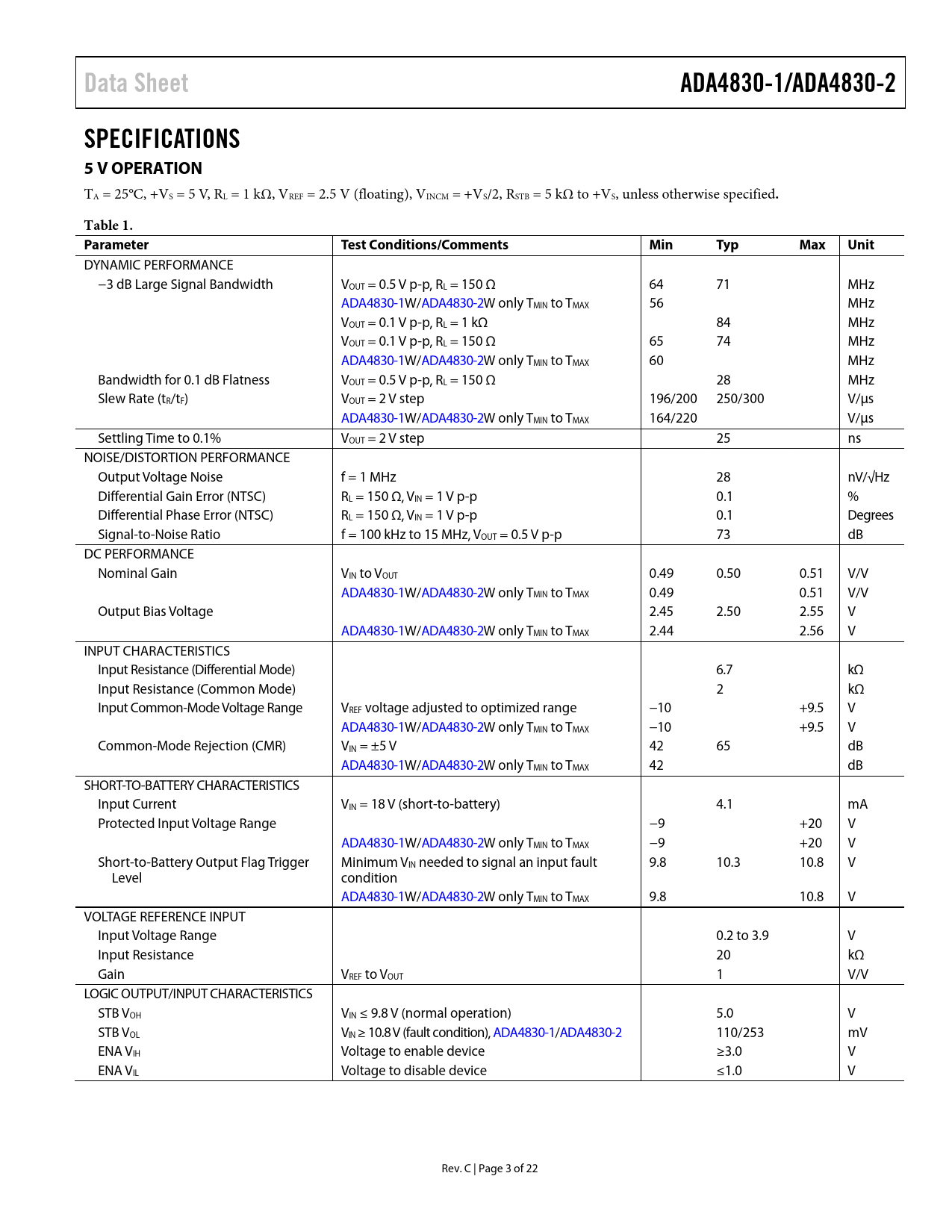 Data SheetADA4830-1/ADA4830-2SPECIFICATIONS 5 V OPERATION TA = 25°C, +VS = 5 V, RL = 1 kΩ, VREF = 2.5 V (floating), VINCM = +VS/2, RSTB = 5 kΩ to +VS, unless otherwise specified .Table 1. ParameterTest Conditions/CommentsMinTypMaxUnit DYNAMIC PERFORMANCE −3 dB Large Signal Bandwidth VOUT = 0.5 V p-p, RL = 150 Ω 64 71 MHz ADA4830-1W/ADA4830-2W only TMIN to TMAX 56 MHz VOUT = 0.1 V p-p, RL = 1 kΩ 84 MHz VOUT = 0.1 V p-p, RL = 150 Ω 65 74 MHz ADA4830-1W/ADA4830-2W only TMIN to TMAX 60 MHz Bandwidth for 0.1 dB Flatness VOUT = 0.5 V p-p, RL = 150 Ω 28 MHz Slew Rate (tR/tF) VOUT = 2 V step 196/200 250/300 V/µs ADA4830-1W/ADA4830-2W only TMIN to TMAX 164/220 V/µs Settling Time to 0.1% VOUT = 2 V step 25 ns NOISE/DISTORTION PERFORMANCE Output Voltage Noise f = 1 MHz 28 nV/√Hz Differential Gain Error (NTSC) RL = 150 Ω, VIN = 1 V p-p 0.1 % Differential Phase Error (NTSC) RL = 150 Ω, VIN = 1 V p-p 0.1 Degrees Signal-to-Noise Ratio f = 100 kHz to 15 MHz, VOUT = 0.5 V p-p 73 dB DC PERFORMANCE Nominal Gain VIN to VOUT 0.49 0.50 0.51 V/V ADA4830-1W/ADA4830-2W only TMIN to TMAX 0.49 0.51 V/V Output Bias Voltage 2.45 2.50 2.55 V ADA4830-1W/ADA4830-2W only TMIN to TMAX 2.44 2.56 V INPUT CHARACTERISTICS Input Resistance (Differential Mode) 6.7 kΩ Input Resistance (Common Mode) 2 kΩ Input Common-Mode Voltage Range VREF voltage adjusted to optimized range −10 +9.5 V ADA4830-1W/ADA4830-2W only TMIN to TMAX −10 +9.5 V Common-Mode Rejection (CMR) VIN = ±5 V 42 65 dB ADA4830-1W/ADA4830-2W only TMIN to TMAX 42 dB SHORT-TO-BATTERY CHARACTERISTICS Input Current VIN = 18 V (short-to-battery) 4.1 mA Protected Input Voltage Range −9 +20 V ADA4830-1W/ADA4830-2W only TMIN to TMAX −9 +20 V Short-to-Battery Output Flag Trigger Minimum VIN needed to signal an input fault 9.8 10.3 10.8 V Level condition ADA4830-1W/ADA4830-2W only TMIN to TMAX 9.8 10.8 V VOLTAGE REFERENCE INPUT Input Voltage Range 0.2 to 3.9 V Input Resistance 20 kΩ Gain VREF to VOUT 1 V/V LOGIC OUTPUT/INPUT CHARACTERISTICS STB VOH VIN ≤ 9.8 V (normal operation) 5.0 V STB VOL VIN ≥ 10.8 V (fault condition), ADA4830-1/ADA4830-2 110/253 mV ENA VIH Voltage to enable device ≥3.0 V ENA VIL Voltage to disable device ≤1.0 V Rev. C | Page 3 of 22 Document Outline Features Applications General Description Functional Block Diagram Table of Contents Revision History Specifications 5 V Operation 3.3 V Operation Absolute Maximum Ratings Thermal Resistance Maximum Power Dissipation ESD Caution Pin Configurations and Function Descriptions Typical Performance Characteristics Theory of Operation Core Amplifier Overvoltage (Short-to-Battery) Protection Short-to-Battery Output Flag ESD Protection Power Supply Pins (ADA4830-2) Applications Information Methods of Transmission Pseudo Differential Mode (Unbalanced Source Termination) Pseudo Differential Mode (Balanced Source Impedance) Fully Differential Mode Voltage Reference (VREF Pin) Input Common-Mode Range Short-to-Battery Output Flag Pin Enable/Disable Modes (ENA Pin) PCB Layout Exposed Paddle (EPAD) Connection Using the ADA4830-2 as a Low Cost Video Switch Driving Capacitive Loads Typical Applications Circuits Fully DC-Coupled Transmission Line Packaging and Ordering Information Outline Dimensions Ordering Guide Automotive Products