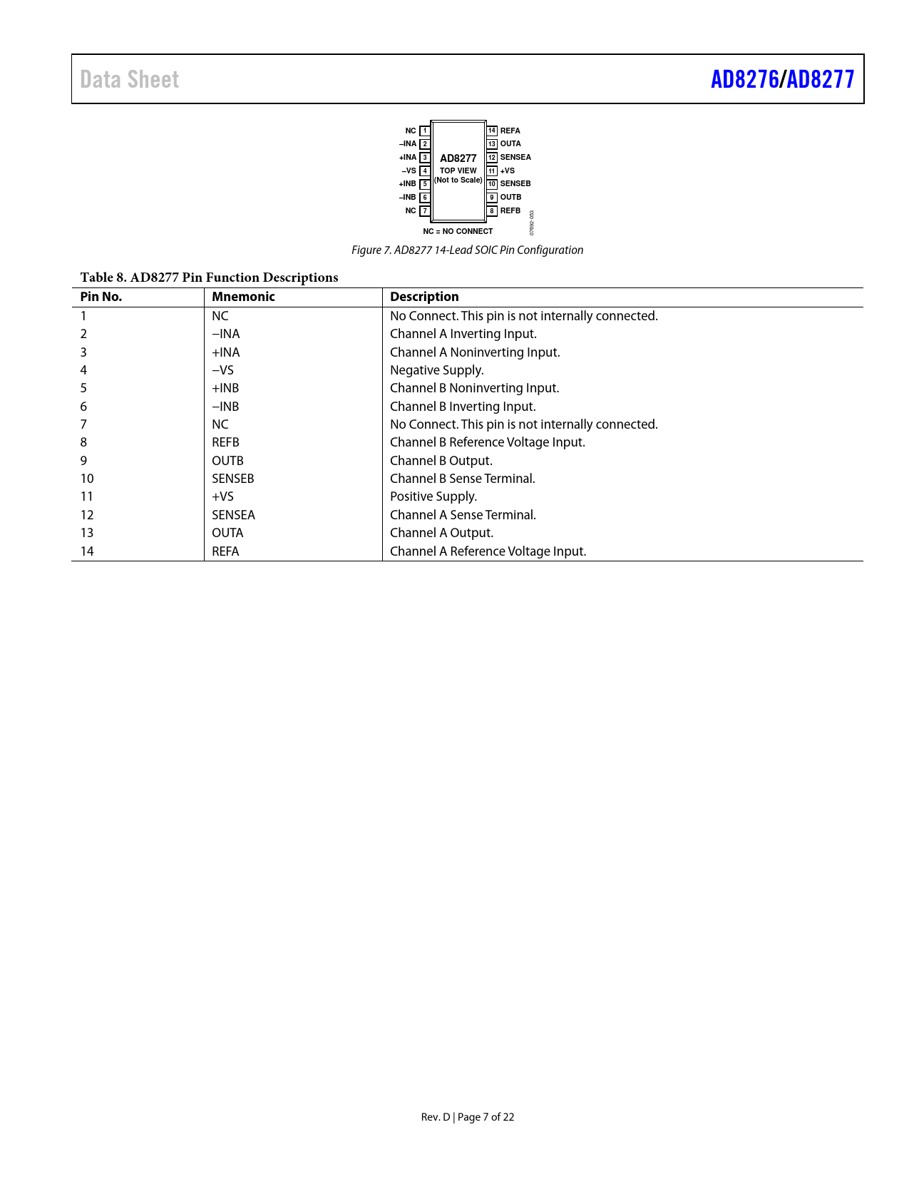 Data SheetAD8276/AD8277NC 114 REFA–INA 213 OUTA+INA 312 SENSEAAD8277–VS 4TOP VIEW11 +VS(Not to Scale)+INB 510 SENSEB–INB 69OUTBNC 78REFB 053 NC = NO CONNECT 07692- Figure 7. AD8277 14-Lead SOIC Pin Configuration Table 8. AD8277 Pin Function Descriptions Pin No.MnemonicDescription 1 NC No Connect. This pin is not internally connected. 2 −INA Channel A Inverting Input. 3 +INA Channel A Noninverting Input. 4 −VS Negative Supply. 5 +INB Channel B Noninverting Input. 6 −INB Channel B Inverting Input. 7 NC No Connect. This pin is not internally connected. 8 REFB Channel B Reference Voltage Input. 9 OUTB Channel B Output. 10 SENSEB Channel B Sense Terminal. 11 +VS Positive Supply. 12 SENSEA Channel A Sense Terminal. 13 OUTA Channel A Output. 14 REFA Channel A Reference Voltage Input. Rev. D | Page 7 of 22 Document Outline Features Applications General Description Functional Block Diagrams Table of Contents Revision History Specifications Absolute Maximum Ratings Thermal Resistance Maximum Power Dissipation Short-Circuit Current ESD Caution Pin Configurations and Function Descriptions Typical Performance Characteristics Theory of Operation Circuit Information DC Performance AC Performance Driving the AD8276/AD8277 Input Voltage Range Power Supplies Applications Information Configurations Differential Output Current Source Voltage and Current Monitoring Instrumentation Amplifier RTD Die Information Die Specifications and Assembly Recommendations Outline Dimensions Ordering Guide