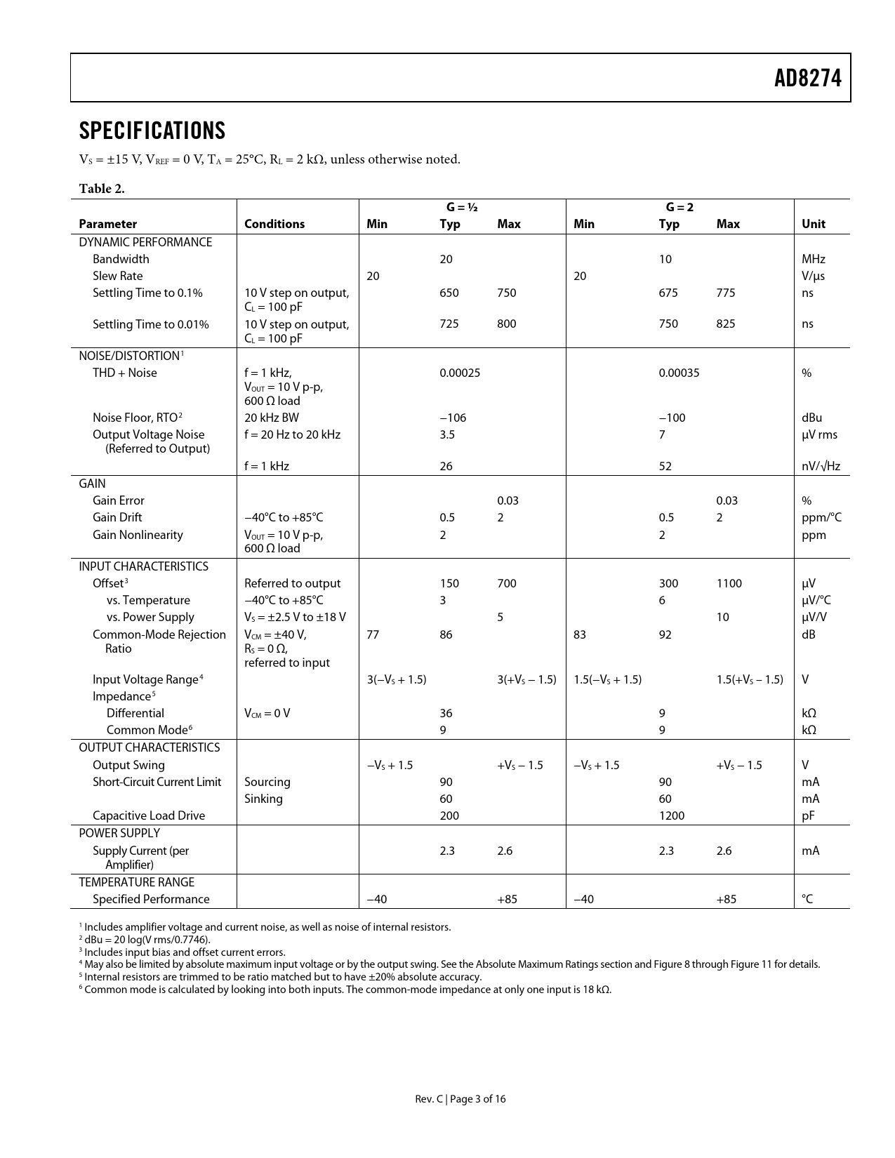 Pages / Page16 / 3 — AD8274. SPECIFICATIONS. Table 2. G = ½. G = 2. Parameter. Conditions. …